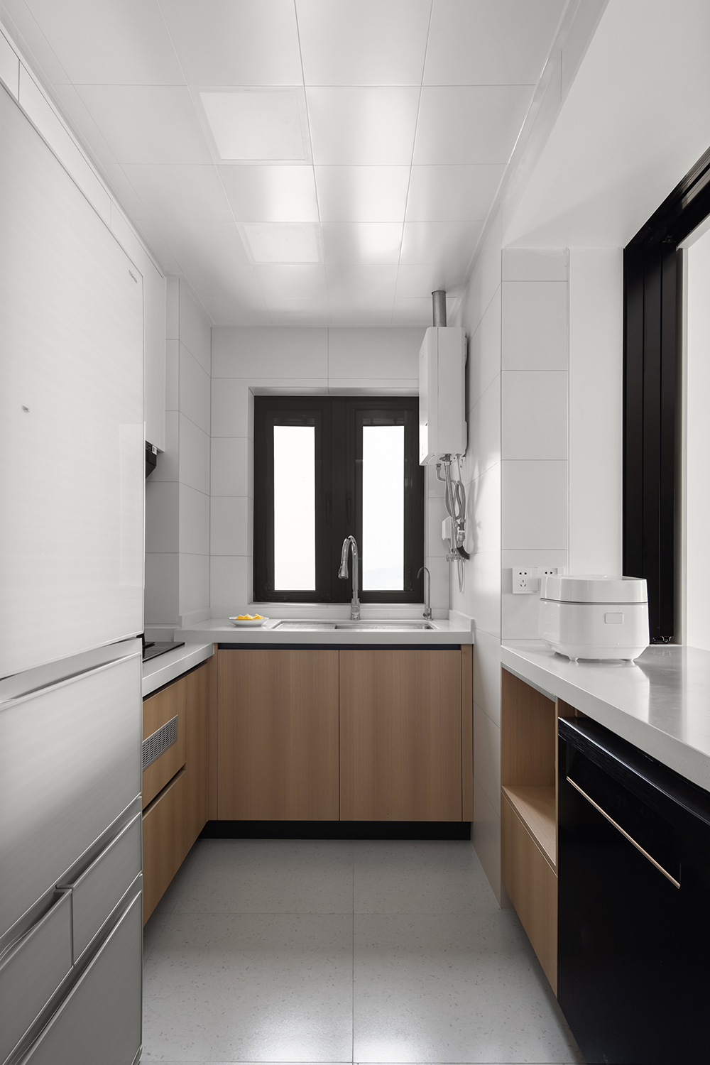 廚房做了一體式的櫥柜布局,整體以白色為主,空間更干凈敞亮。上下都做了柜子,讓廚房收納空間更充足。