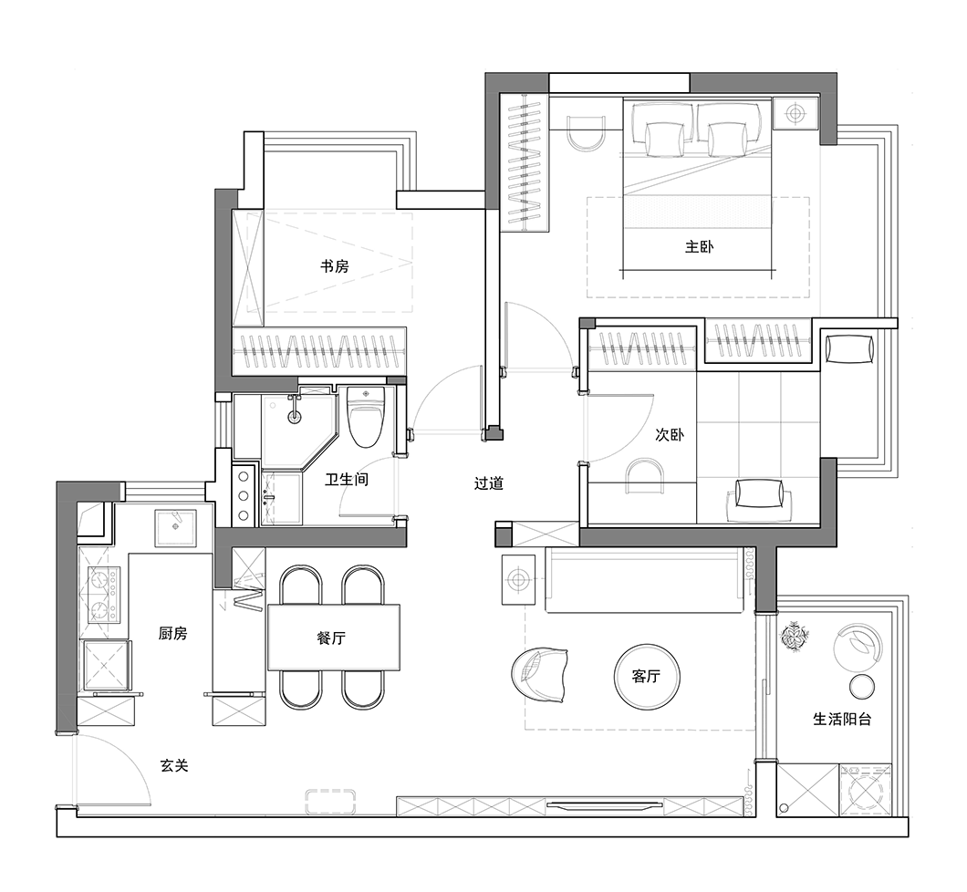 本案業(yè)主為小年輕夫婦,家中現(xiàn)在基本是兩人居住,未來會有小朋友。女主人愛好花草花藝,希望保留開放陽臺,男主人需要單獨書房辦公閱讀,偶爾可兼顧客房功能。