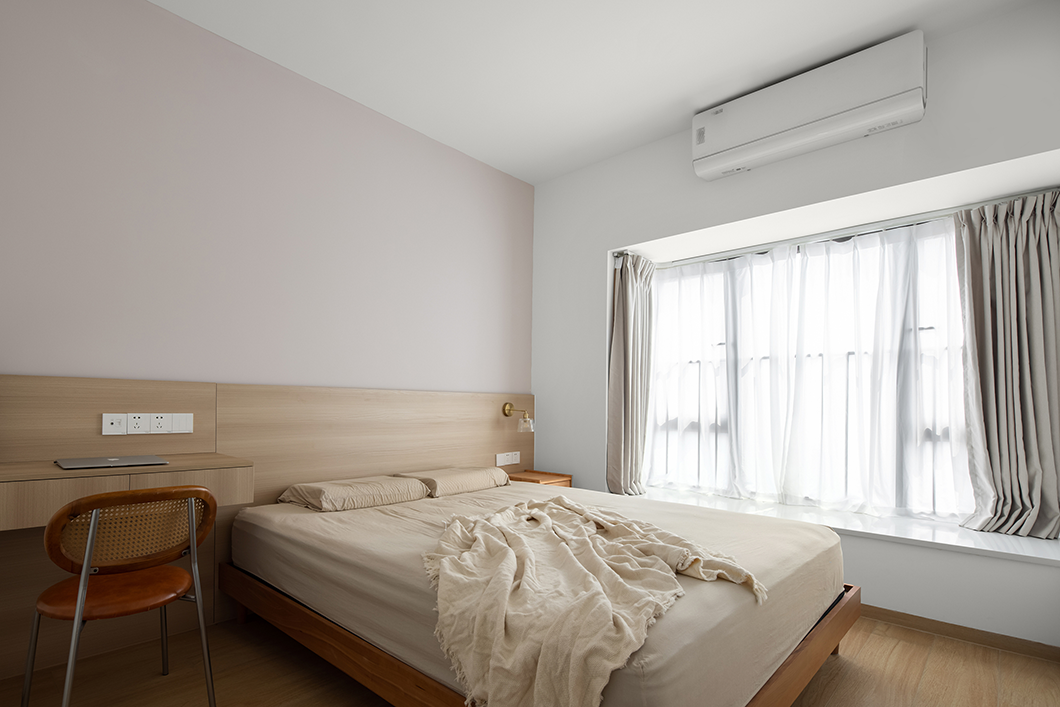 主臥簡簡單單,奶油白的墻面,搭配原木家具和米黃色床品,營造出舒適溫馨的睡眠環(huán)境。