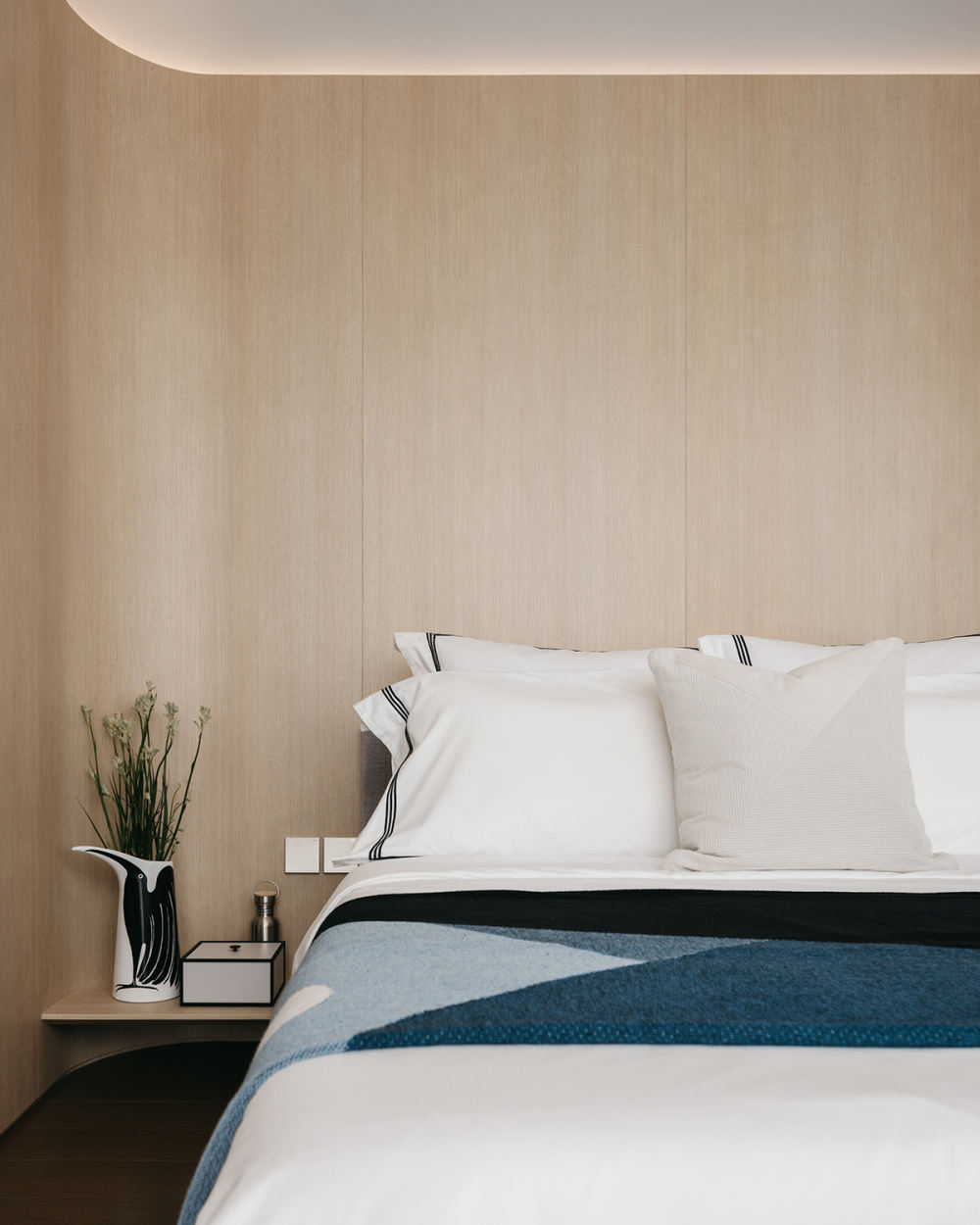 這樣的想法也可以在主臥室看到?,F(xiàn)有的臥室 2 與主臥室相結(jié)合,營造出豪華的布局,無縫橡木飾面墻板作為主臥室的背景,俯瞰中巴魯村一覽無余的景色。