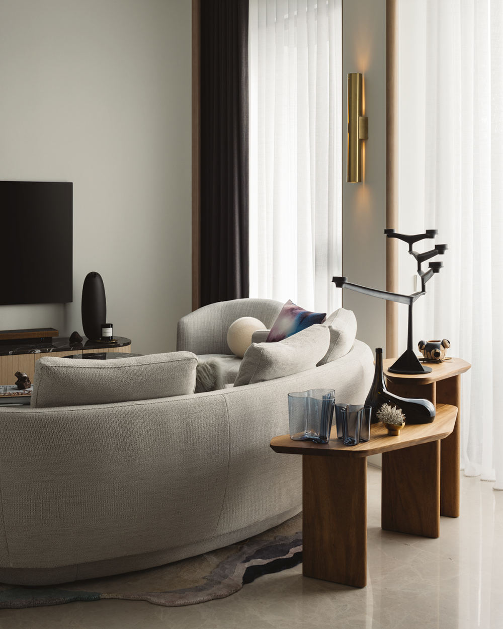 “自然界中不存在直線”這是我們的客戶分享的一句話,在我們經(jīng)常在這套公寓中尋找曲線和紋理時(shí),它為我們策劃家具和陳設(shè)提供了靈感。
