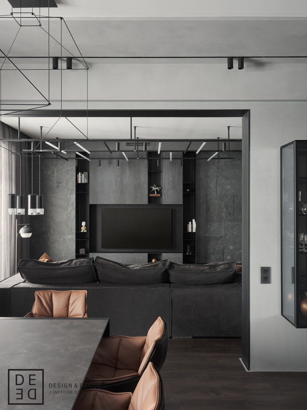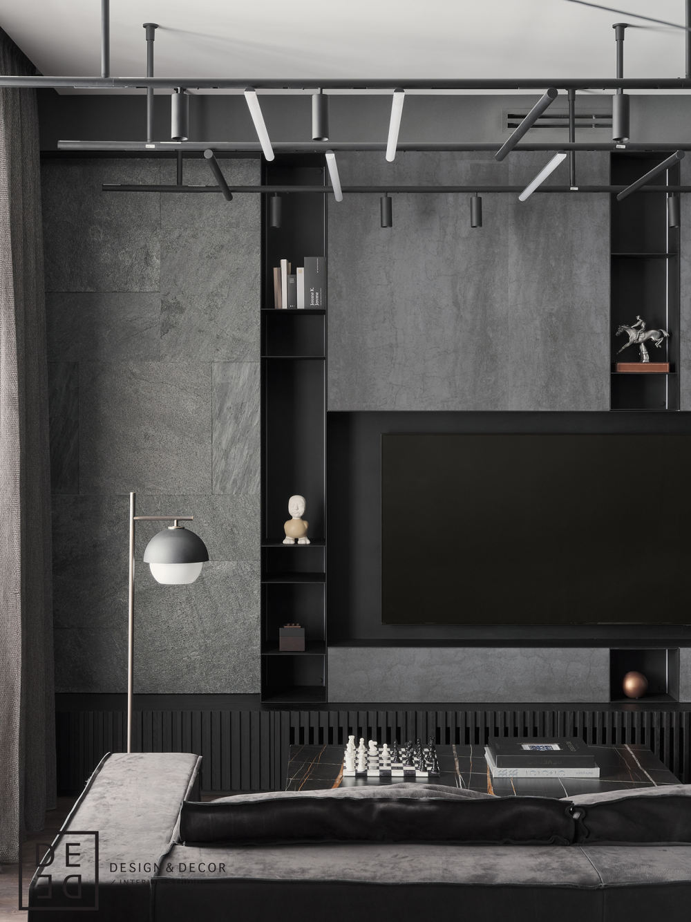 為了裝飾客廳的媒體區(qū),我們使用了主臥室設(shè)計(jì)中也使用的天然石板。 廚房設(shè)計(jì)也以陽(yáng)剛的方式制作,包括金屬和陶瓷飾面。 客廳布局的中央是時(shí)尚的“Budapest”沙發(fā),采用“Baxter”的正絨面革飾面。