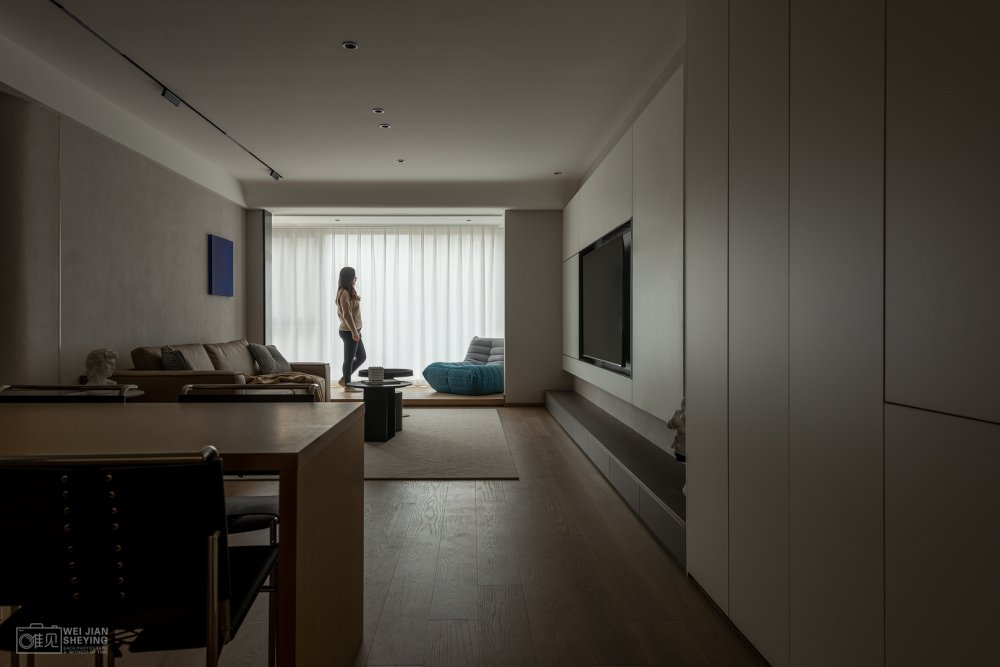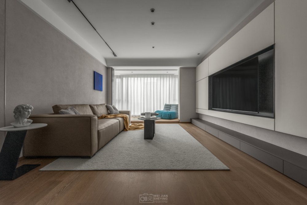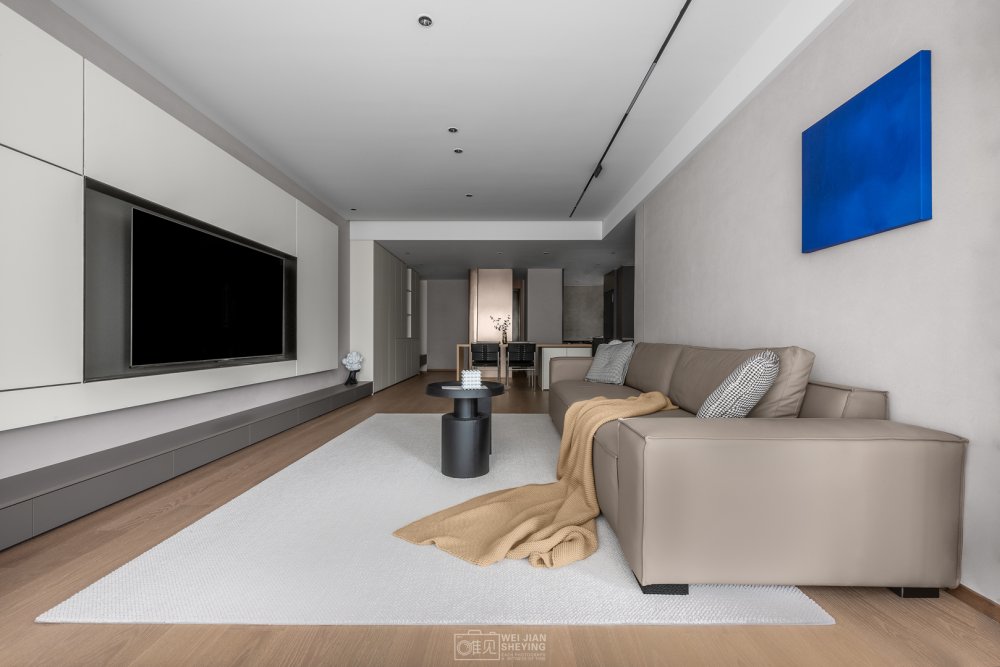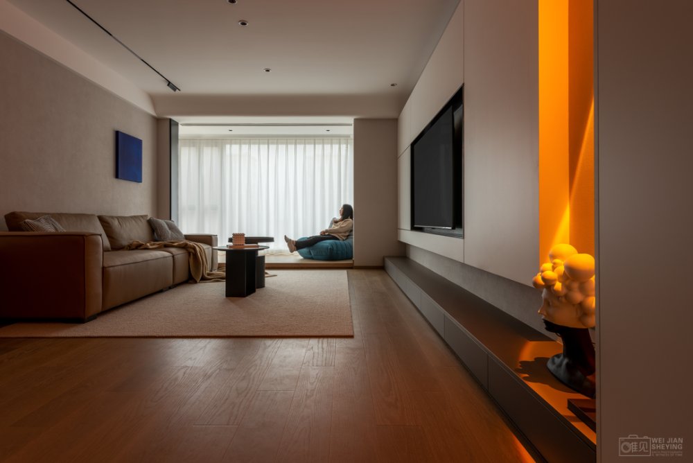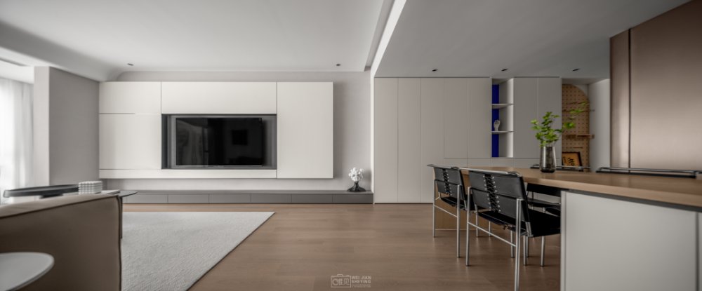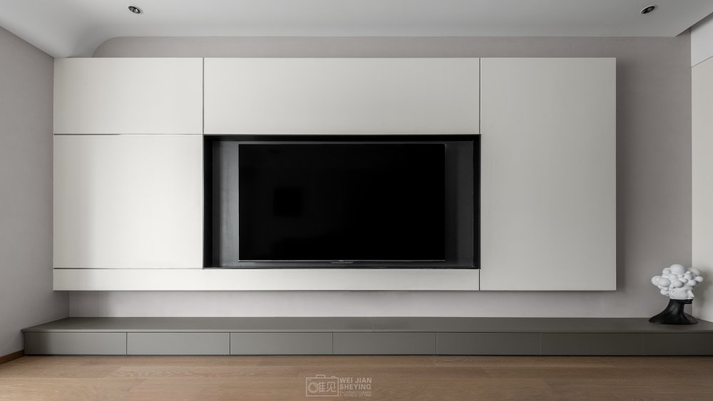 電視置掛于懸浮柜體中,遵循著減法原則,縫隙形成線條美感,中間黑色的框不僅與白色強(qiáng)烈對(duì)比,并且電視也消隱在其中和背景形成統(tǒng)一性。