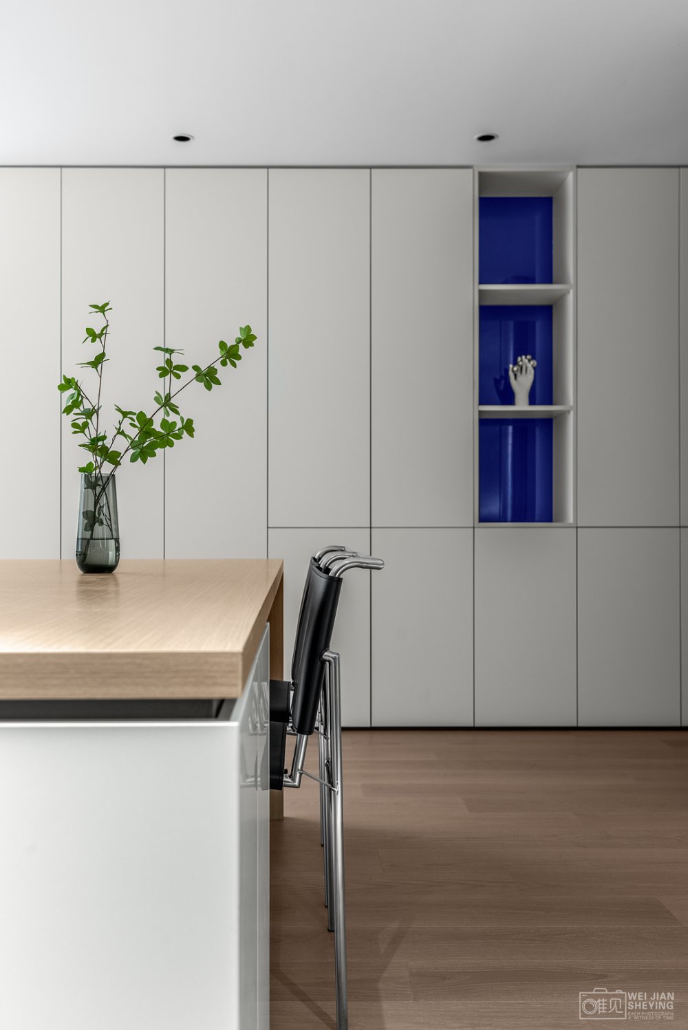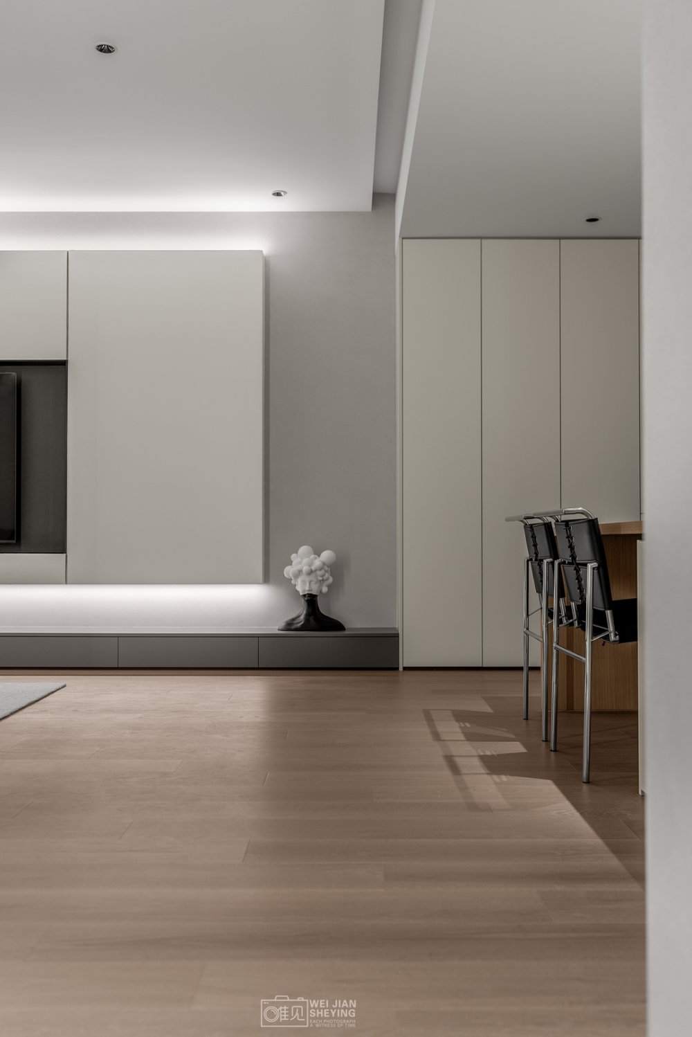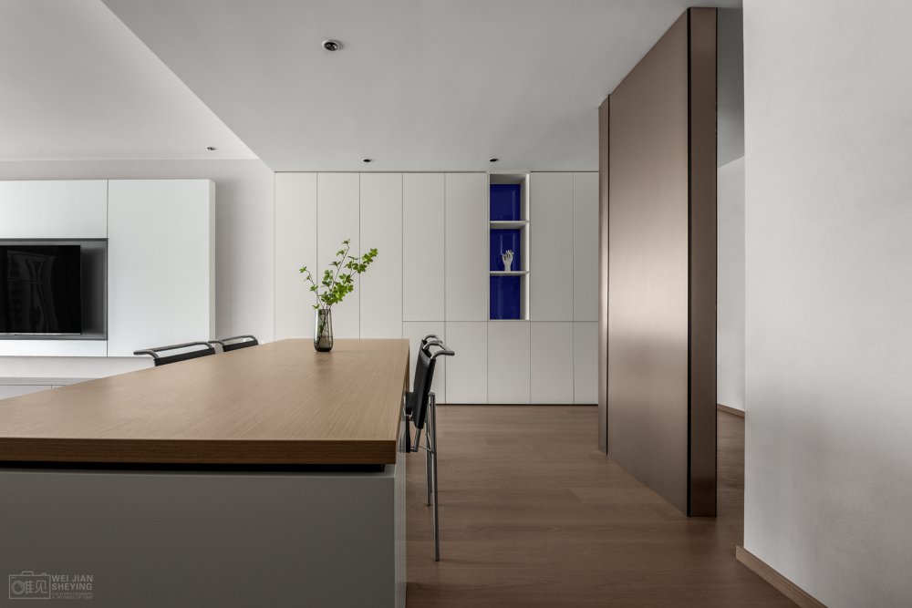 電視置掛于懸浮柜體中,遵循著減法原則,縫隙形成線條美感,中間黑色的框不僅與白色強(qiáng)烈對(duì)比,并且電視也消隱在其中和背景形成統(tǒng)一性。