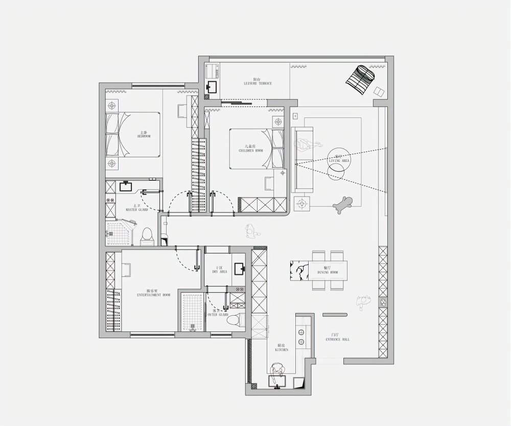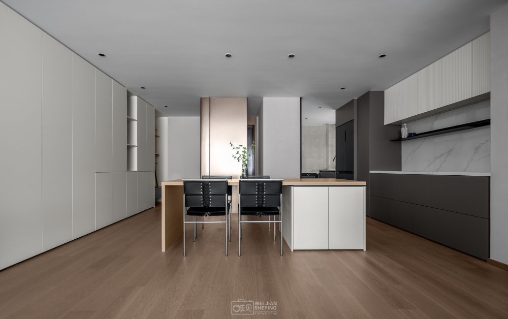 空間縱向排列設(shè)計(jì),形成不同的分區(qū)和氛圍??筒蛷d敞開(kāi),連接休閑陽(yáng)臺(tái),舍棄多余的結(jié)構(gòu),在動(dòng)線的安排上更符合年輕人的生活習(xí)慣。