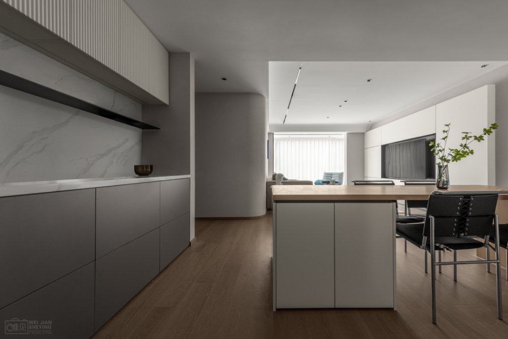 餐廳定制餐邊柜,顏色以灰白色為主體色調(diào)和客廳為一體,既區(qū)分又能融合。長(zhǎng)條狀實(shí)木餐桌,同時(shí)滿足業(yè)主就餐、辦公以及玩樂(lè)等多功能需求。