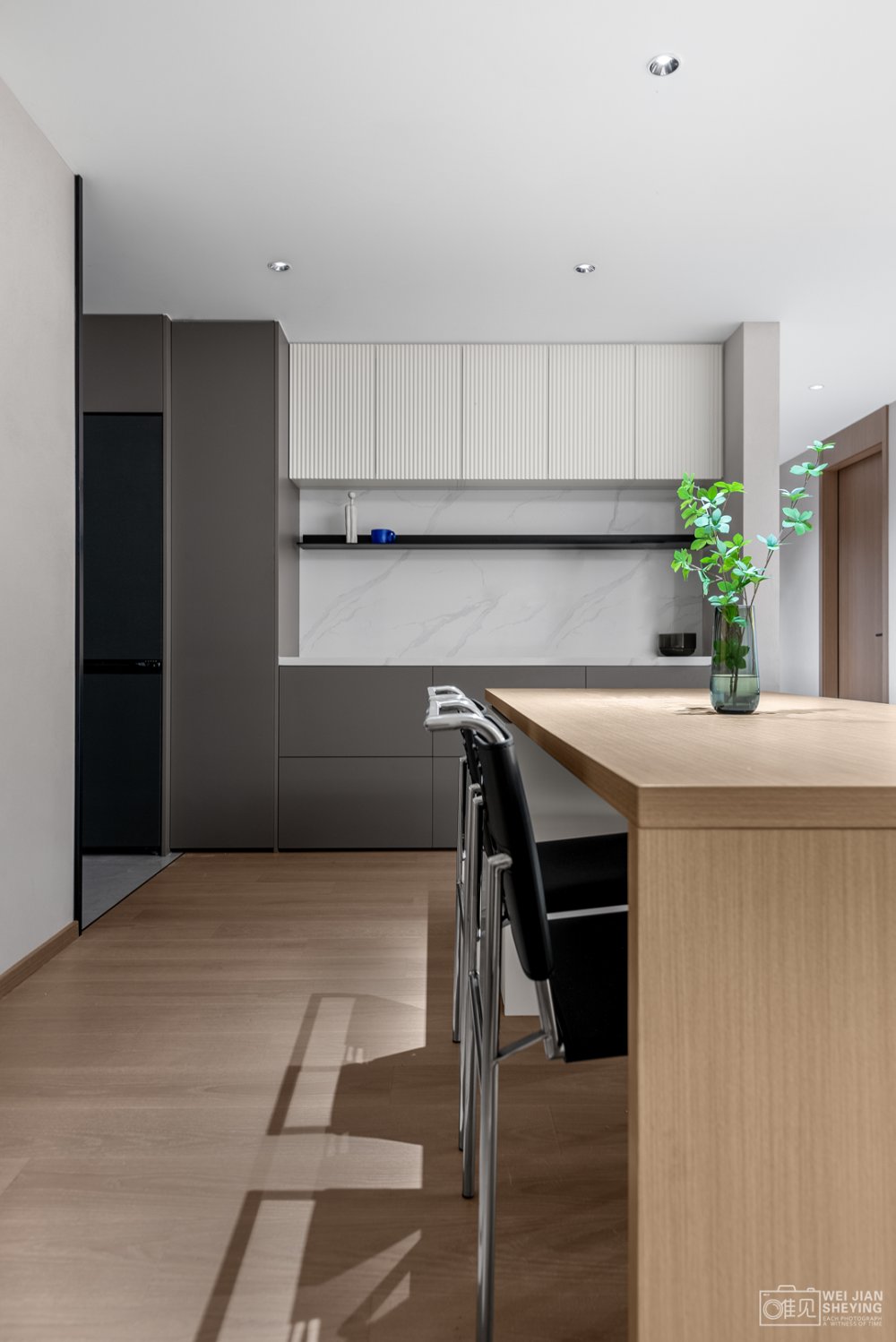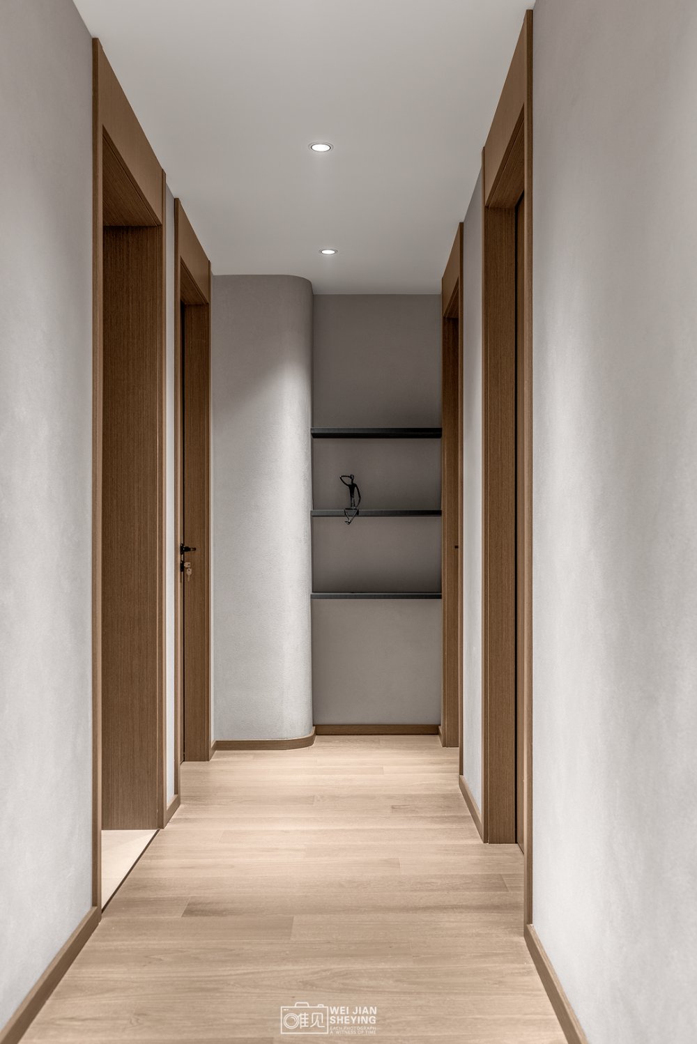 走道不做多余的裝飾,最簡(jiǎn)單的平鋪直述,通過(guò)造型的不同形態(tài)與肌理表達(dá)空間的明暗層次感。