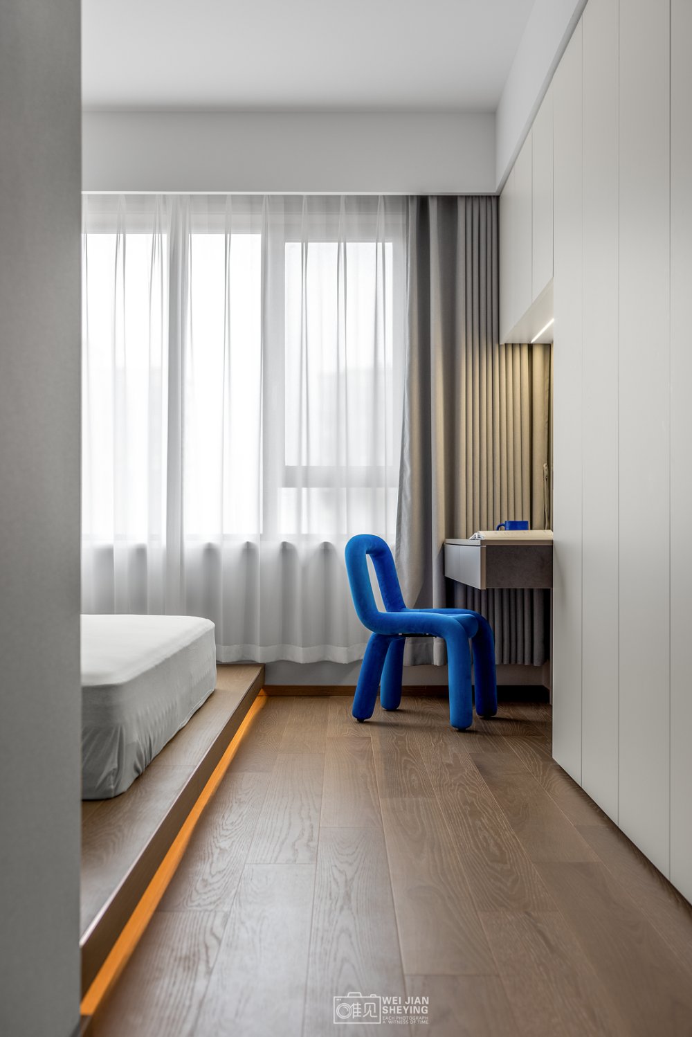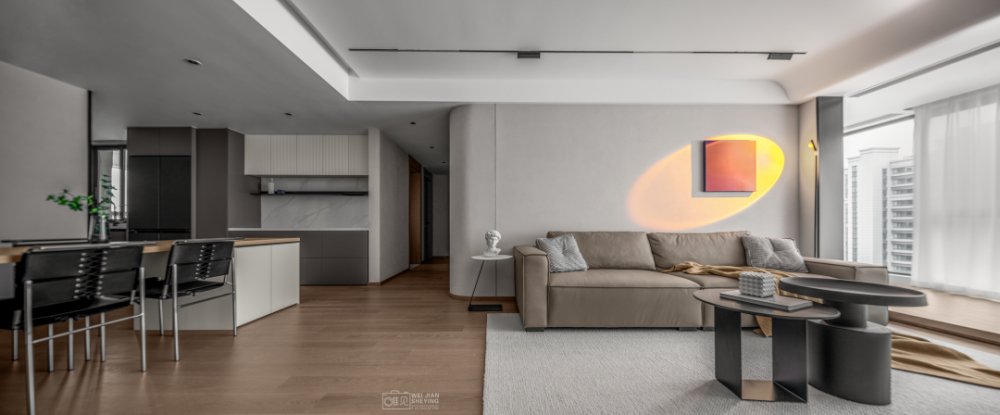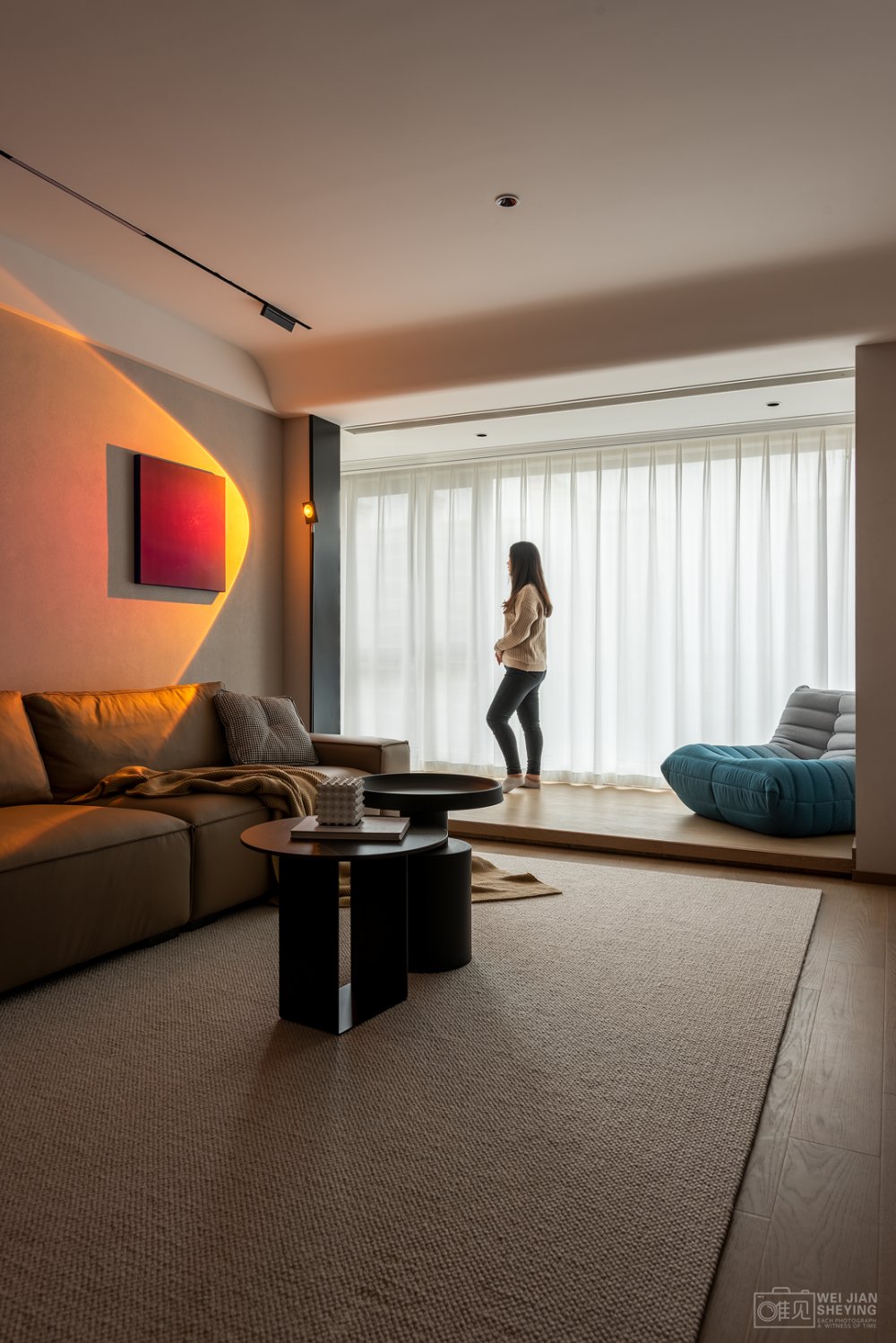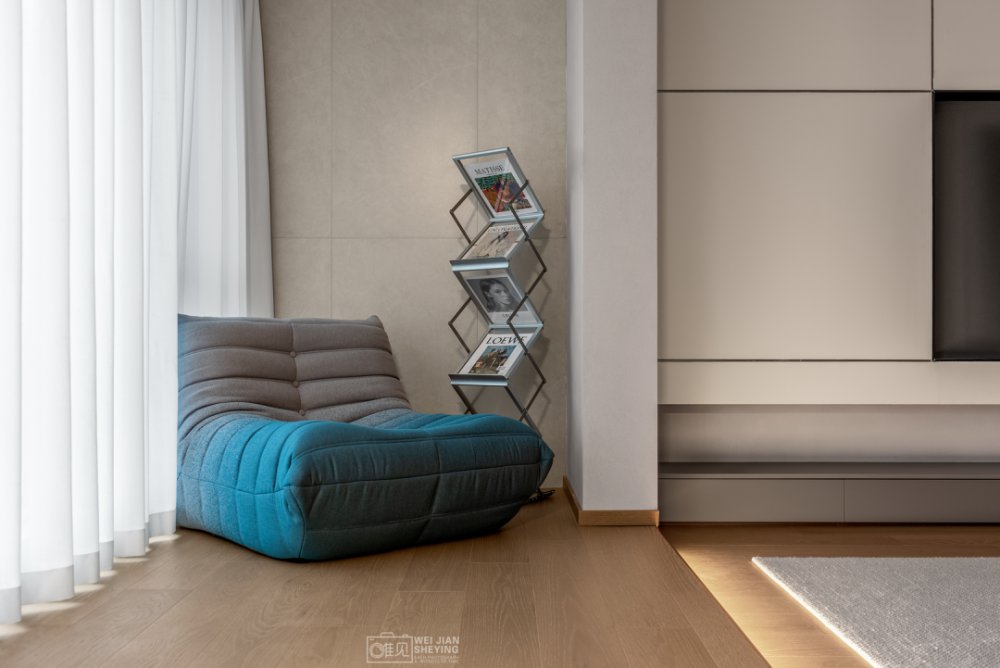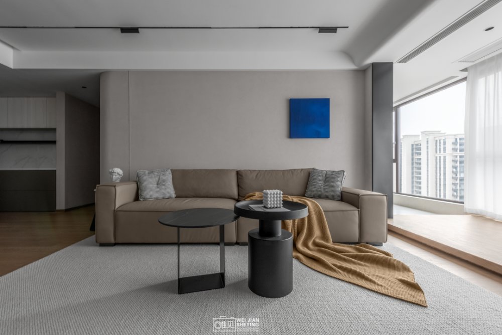 陽(yáng)光穿透客廳,透過(guò)輕盈的薄紗,柔和的光源提升了空間的溫柔氣息,藍(lán)色裝飾畫(huà),耀眼閃亮。