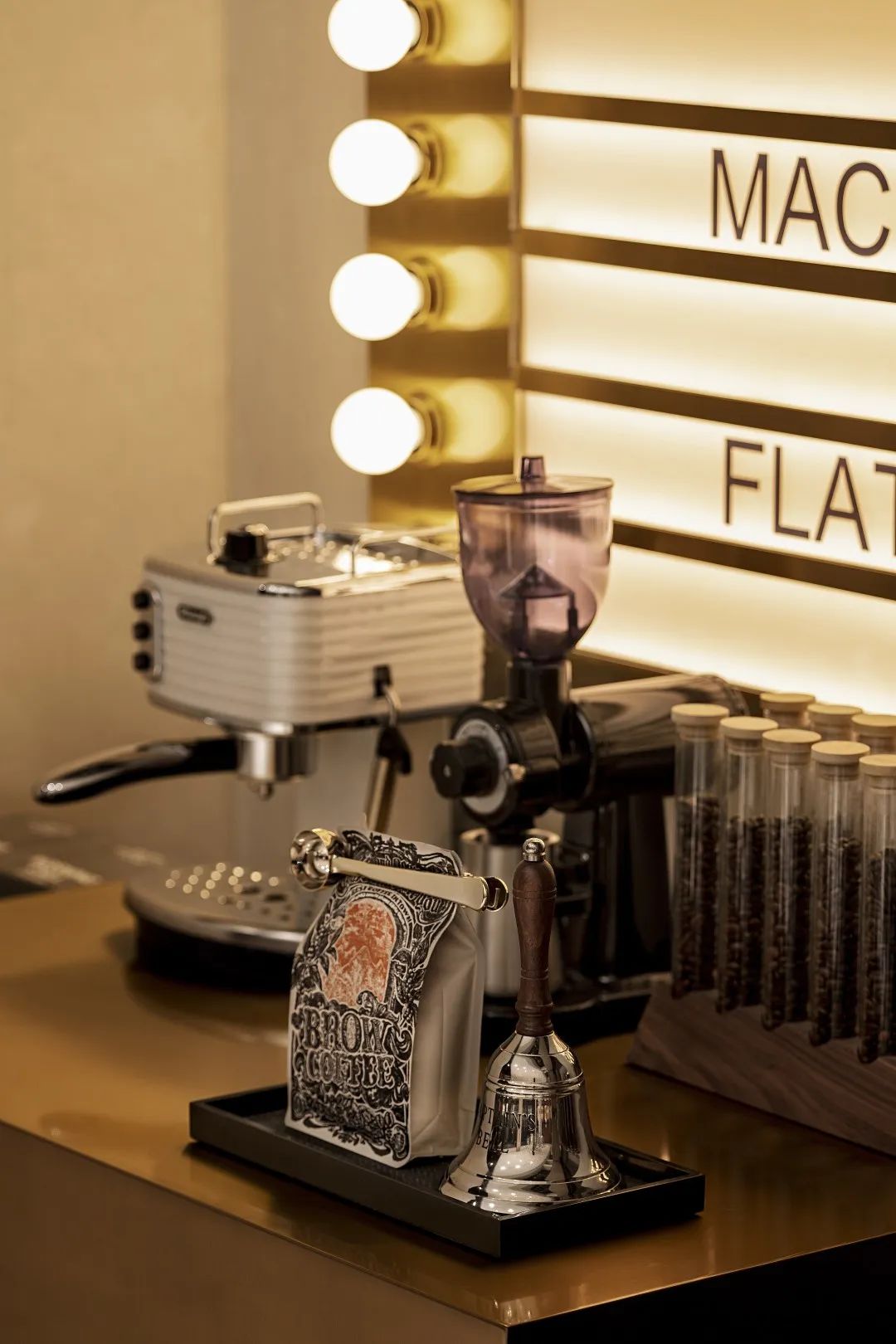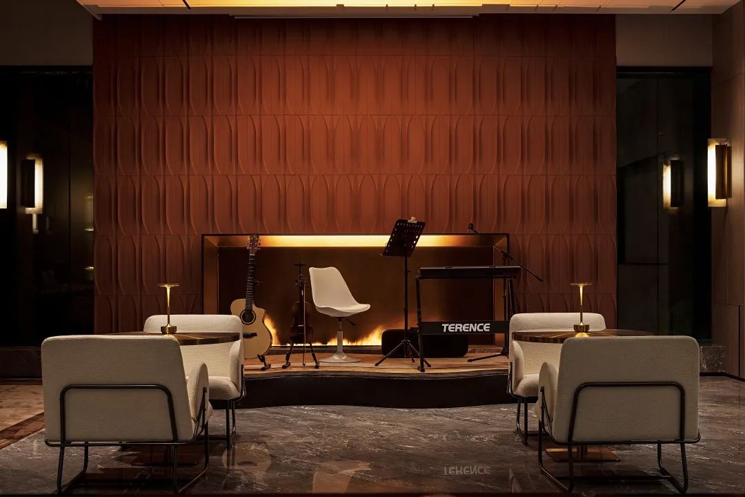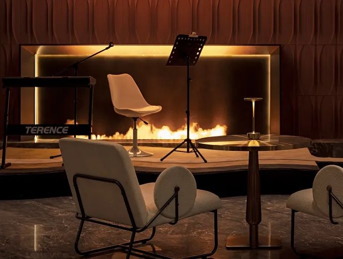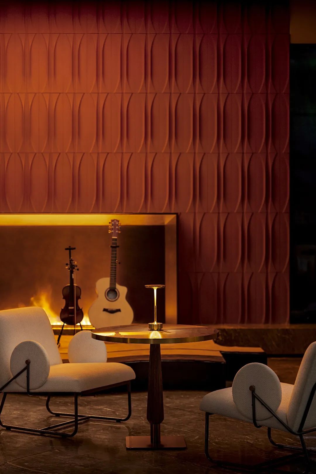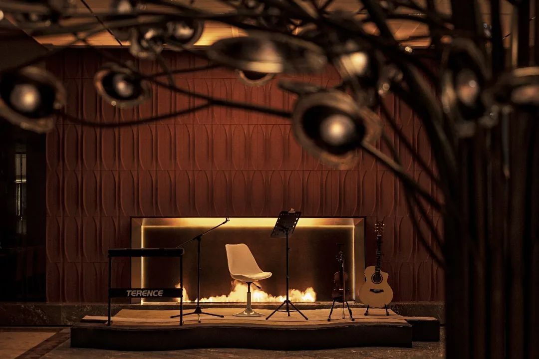 呼應(yīng)早咖晚酒生活形態(tài),將裝置樹植入空間中,配合樂器,營造出現(xiàn)場(chǎng)演唱會(huì)氣氛。一面是新科技感的藝術(shù)裝置樹,一面是具有極高質(zhì)感的紅色磚造型墻與熊熊火爐、紅與金的搭配,新舊的碰撞煥發(fā)著十足的空間張力。