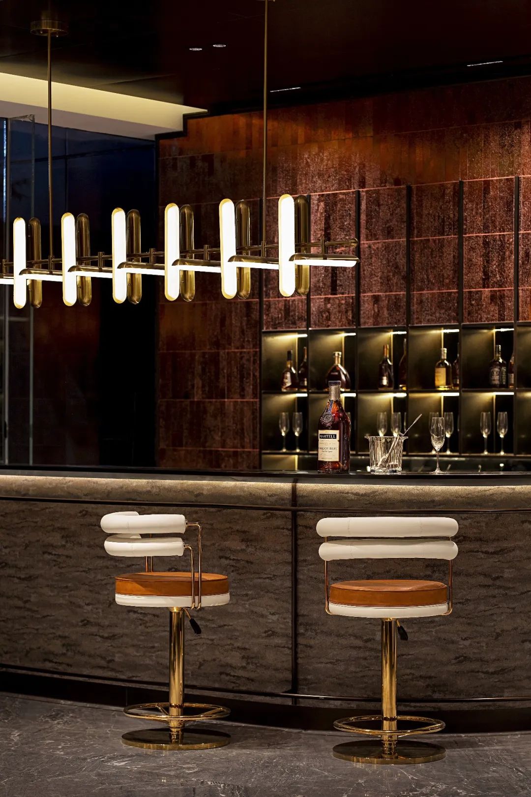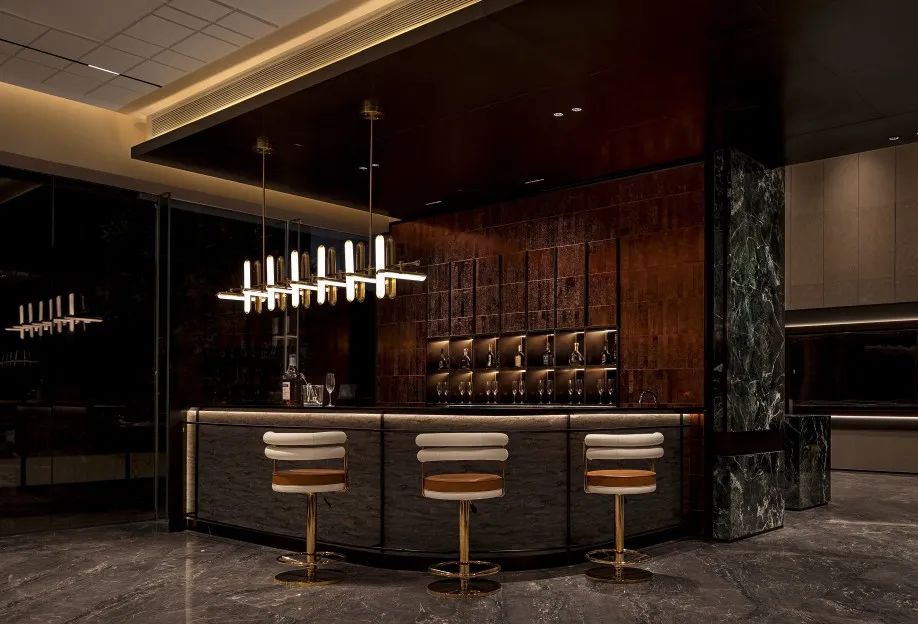 調(diào)節(jié)室內(nèi)空間氛圍,冷冽與華貴的金屬磚與粗糙質(zhì)感的灰色巖板,細(xì)膩與粗狂的對(duì)比,通過現(xiàn)代性裝飾語言的轉(zhuǎn)化,回應(yīng)了空間應(yīng)有的厚度與質(zhì)感。一面輕緩、一面醇厚,營造生活的氛圍,傳達(dá)出一種生活方式、一種生活態(tài)度。