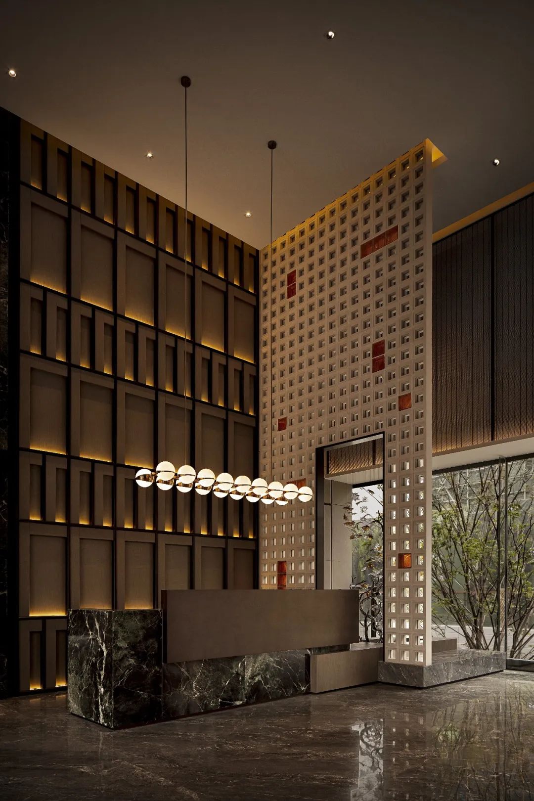 重新排布格局,將地面局部抬高,定制的陶磚屏風(fēng)高墻區(qū)隔,用當(dāng)代語言重新演繹園林的多進(jìn)式動(dòng)線布局,打造大堂的有趣性,玩出空間質(zhì)感。