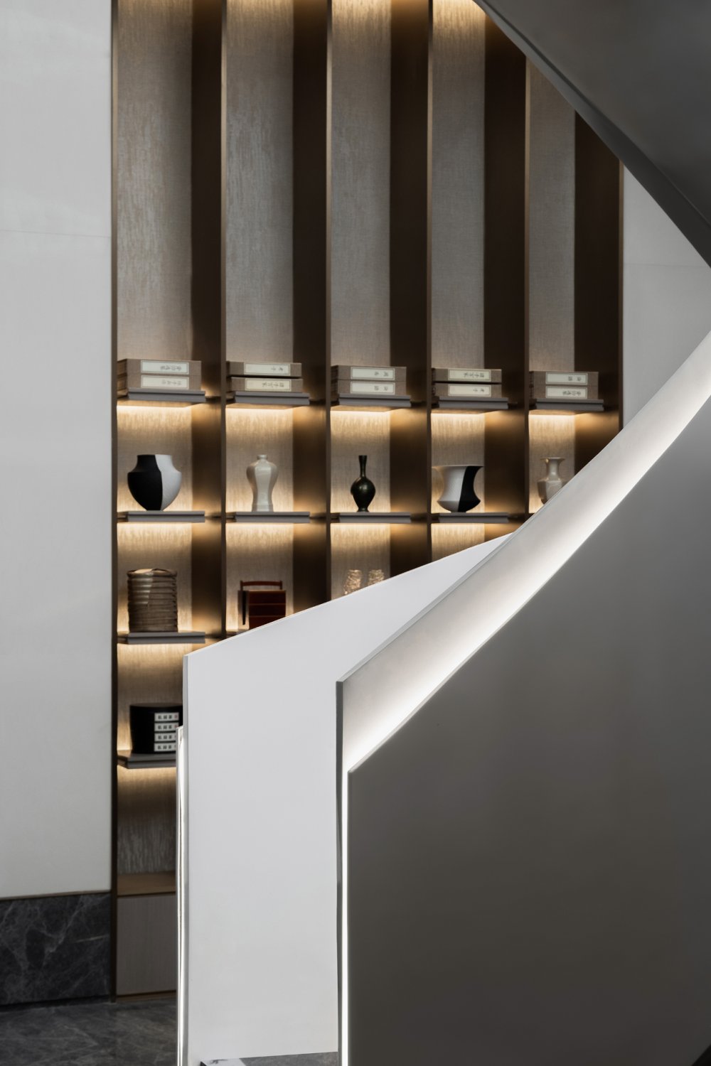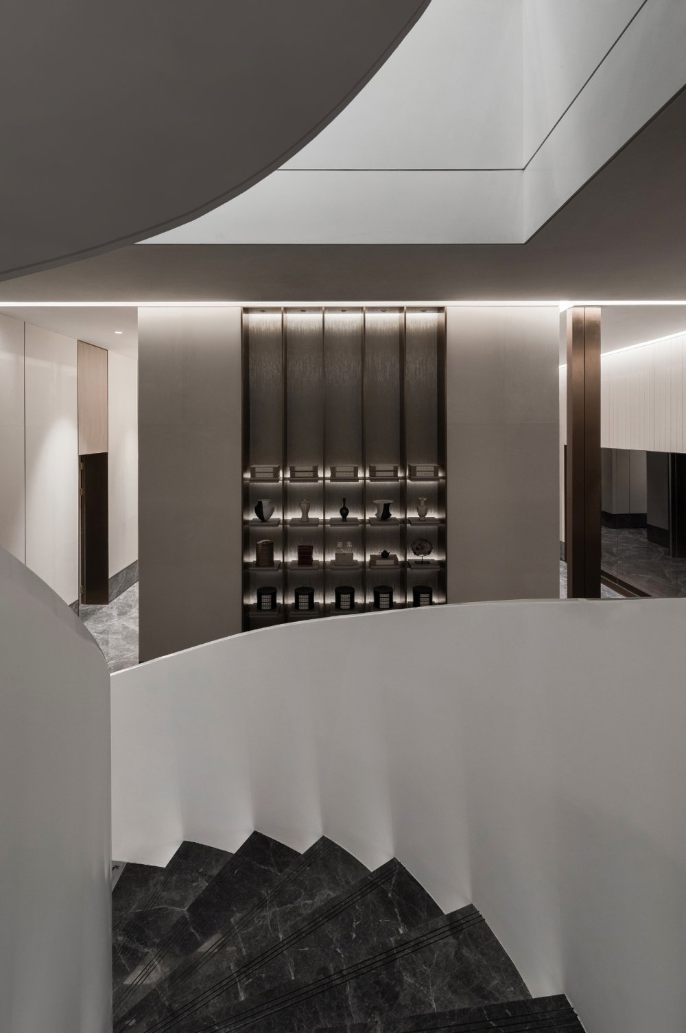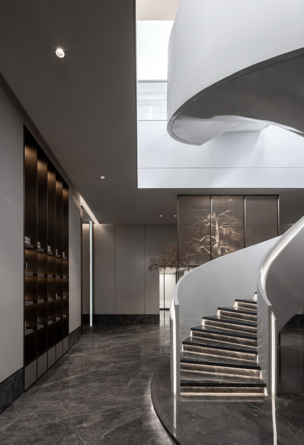 空間關(guān)系的微妙,在于息息相關(guān)而又視覺獨立,于觀者踱步間,引人入勝。設(shè)計者運用線條的不同性格,旋轉(zhuǎn)樓梯曲線的旋轉(zhuǎn)與動感,賦予空間多變情緒。開放式構(gòu)設(shè)空間,在虛實互映中,與橫平豎直的線條產(chǎn)生流動的力量感,遠觀近賞皆不群,交織出自然的詩意與東方的優(yōu)雅。