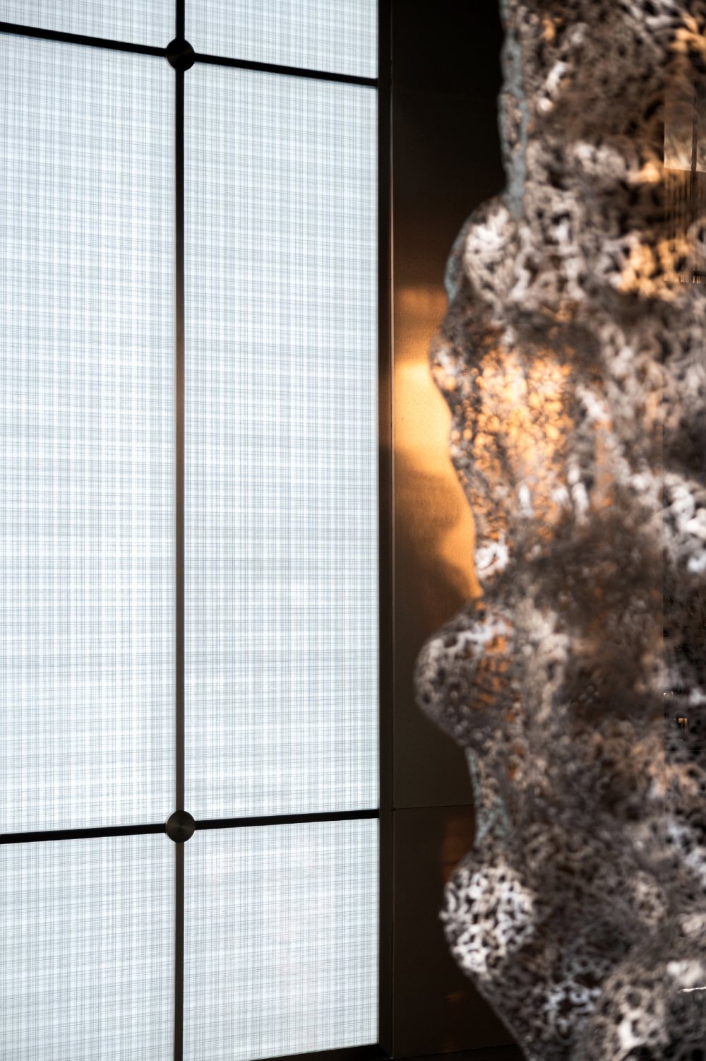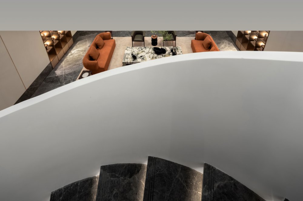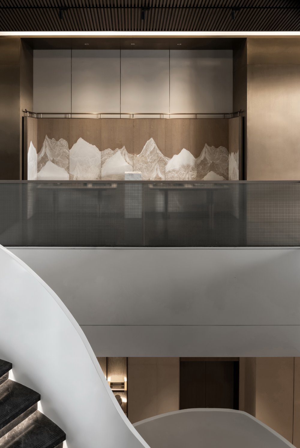 空間關(guān)系的微妙,在于息息相關(guān)而又視覺獨立,于觀者踱步間,引人入勝。設(shè)計者運用線條的不同性格,旋轉(zhuǎn)樓梯曲線的旋轉(zhuǎn)與動感,賦予空間多變情緒。開放式構(gòu)設(shè)空間,在虛實互映中,與橫平豎直的線條產(chǎn)生流動的力量感,遠觀近賞皆不群,交織出自然的詩意與東方的優(yōu)雅。
