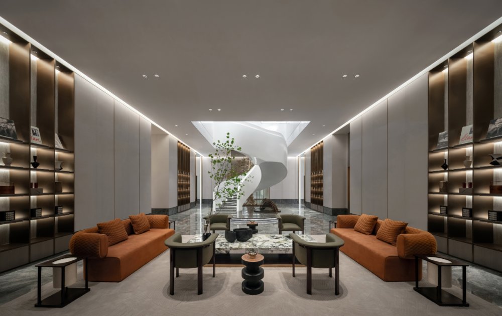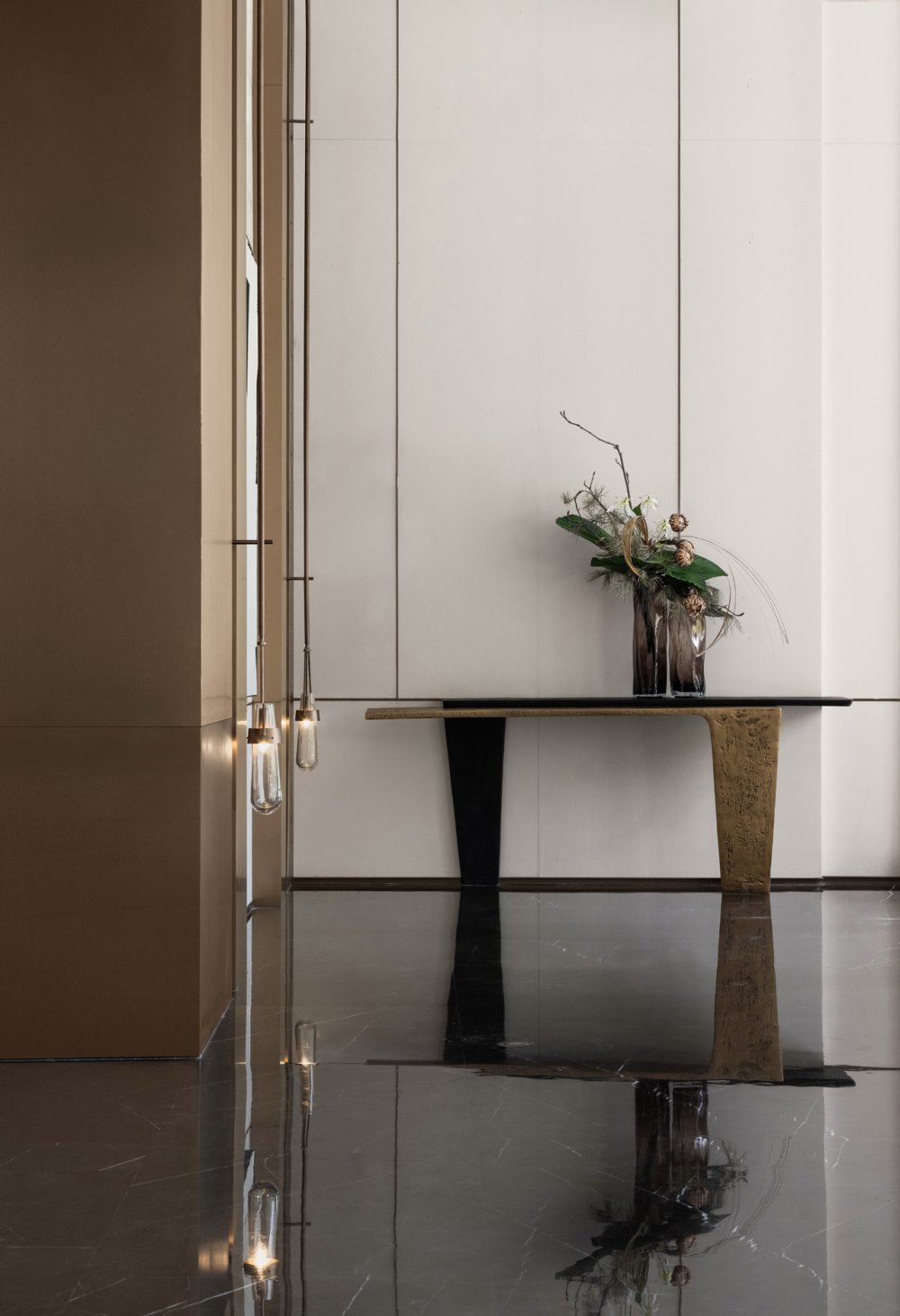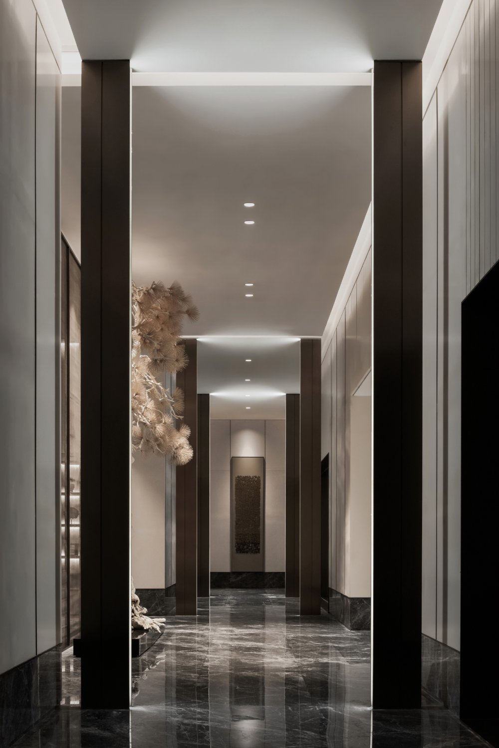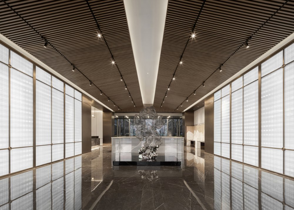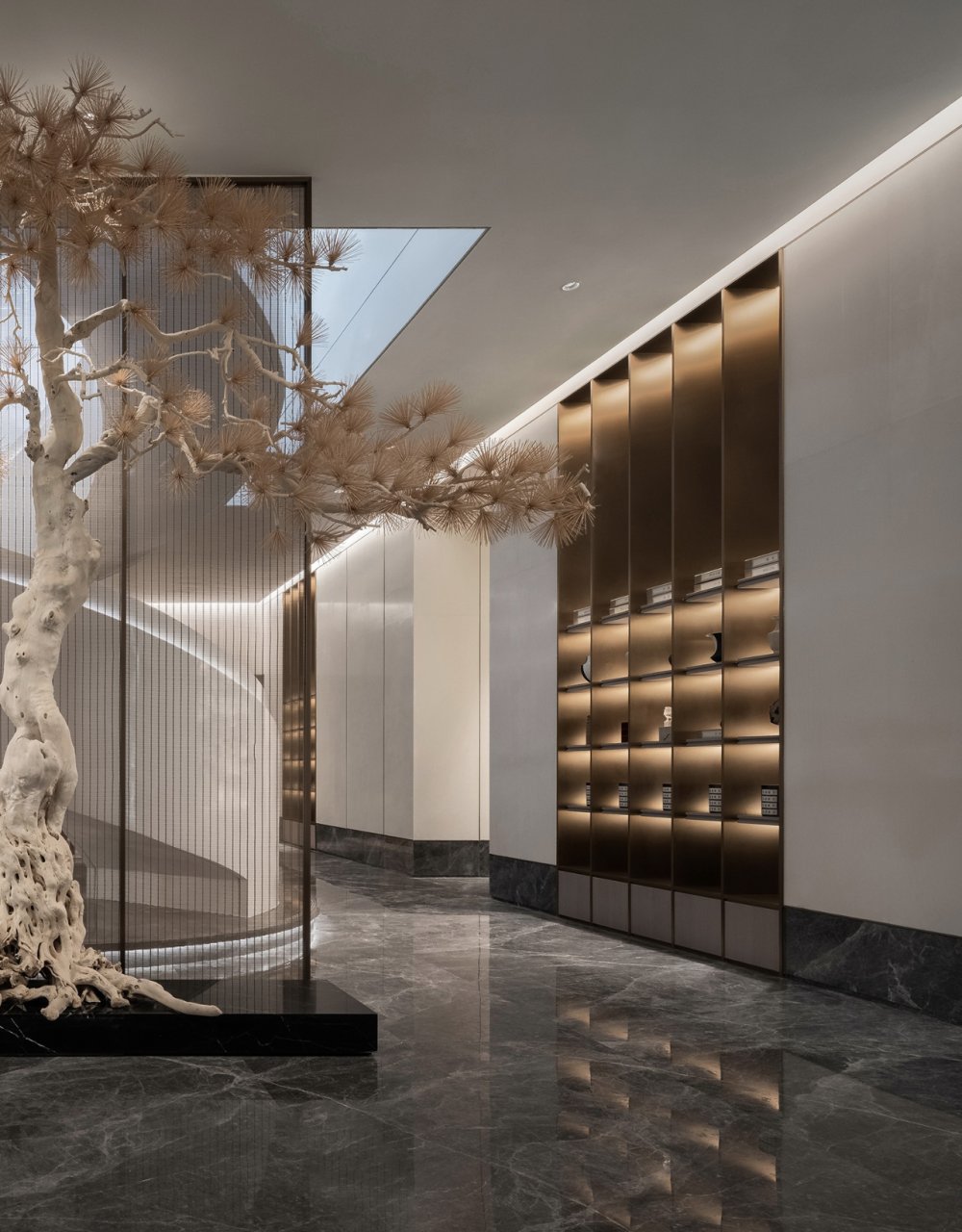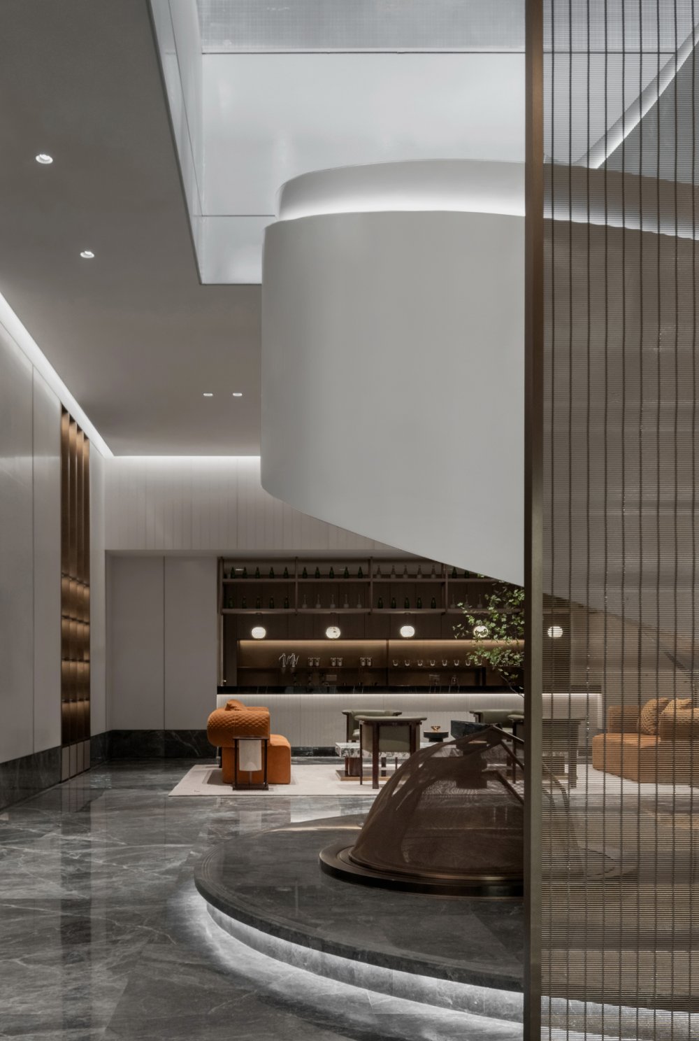 以禮為制,建筑的空間層次和序列沿對稱軸循序漸進,營造出酒店式歸家儀式感??臻g頂面斜屋頂造型與建筑“披檐”元素相得益彰,達到無邊界的自然融合。以中原文化為立意點,當(dāng)代藝術(shù)手法予以轉(zhuǎn)譯,令置身于空間的人在虛實之間,感受超越時間與空間的壯闊。