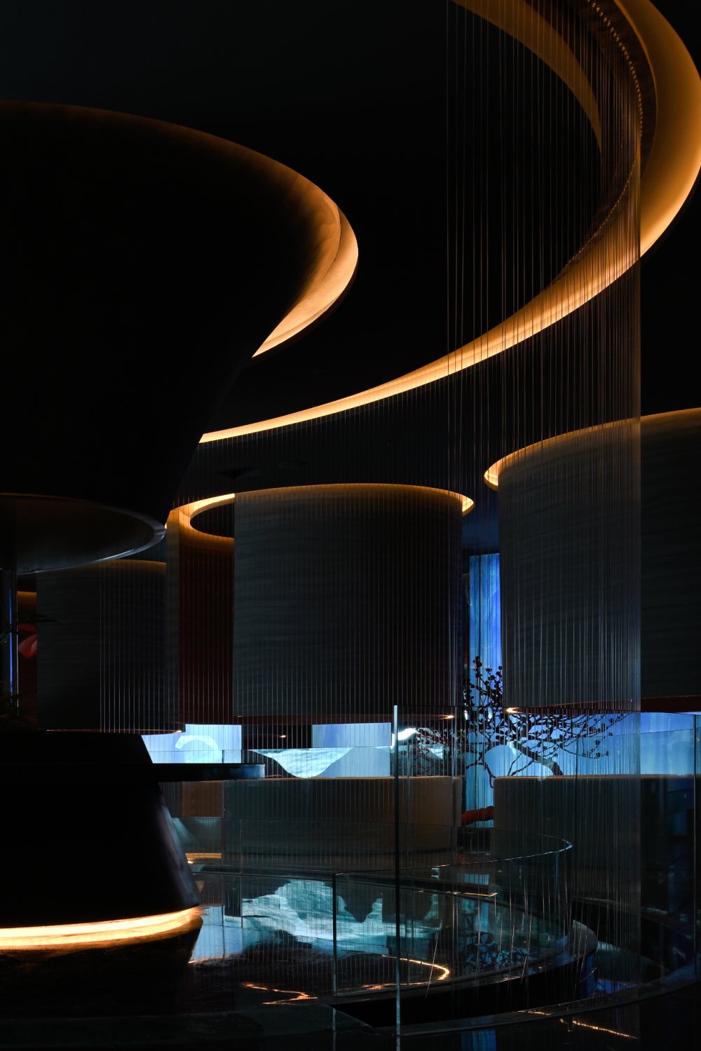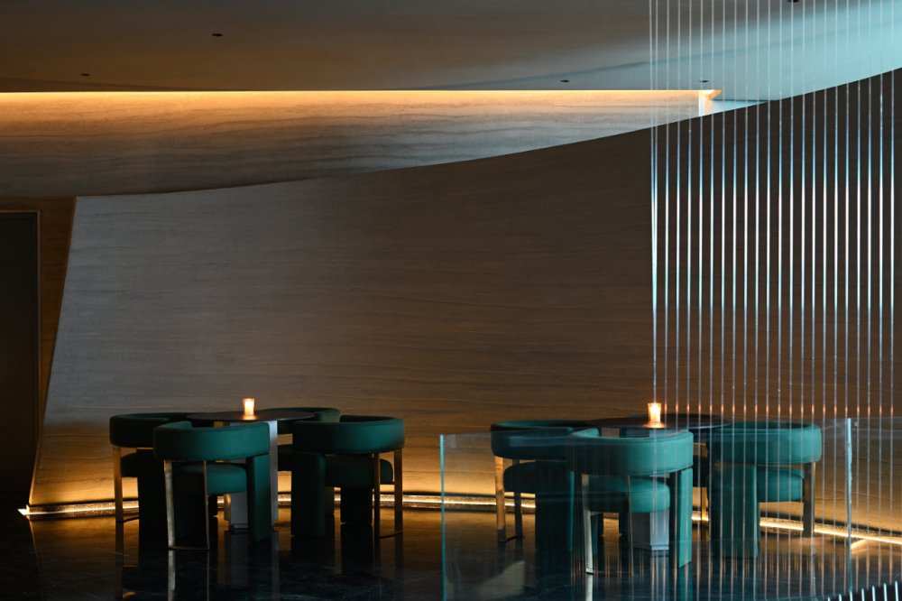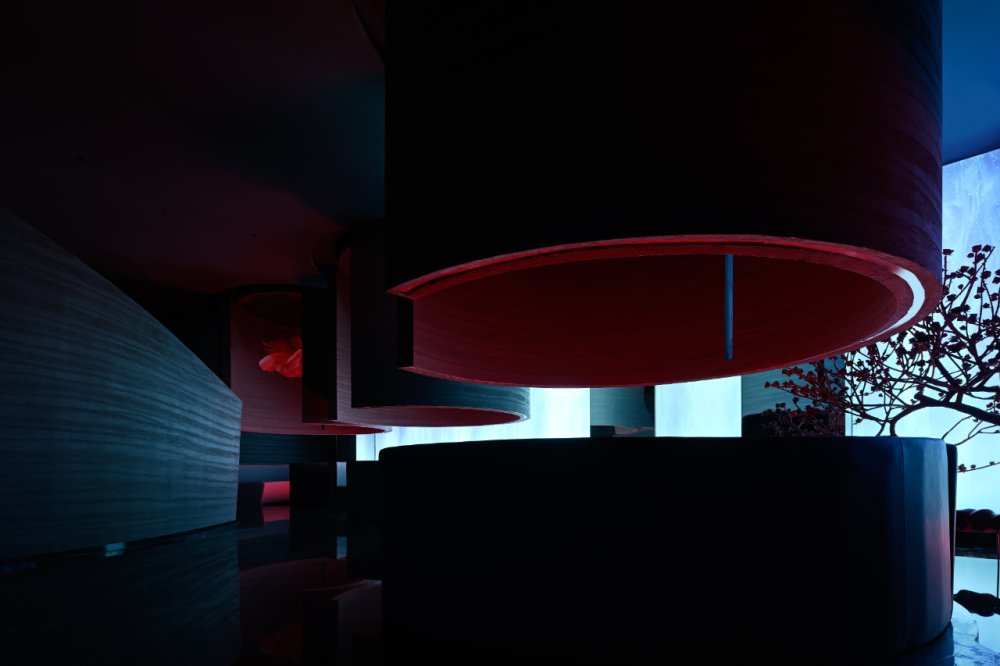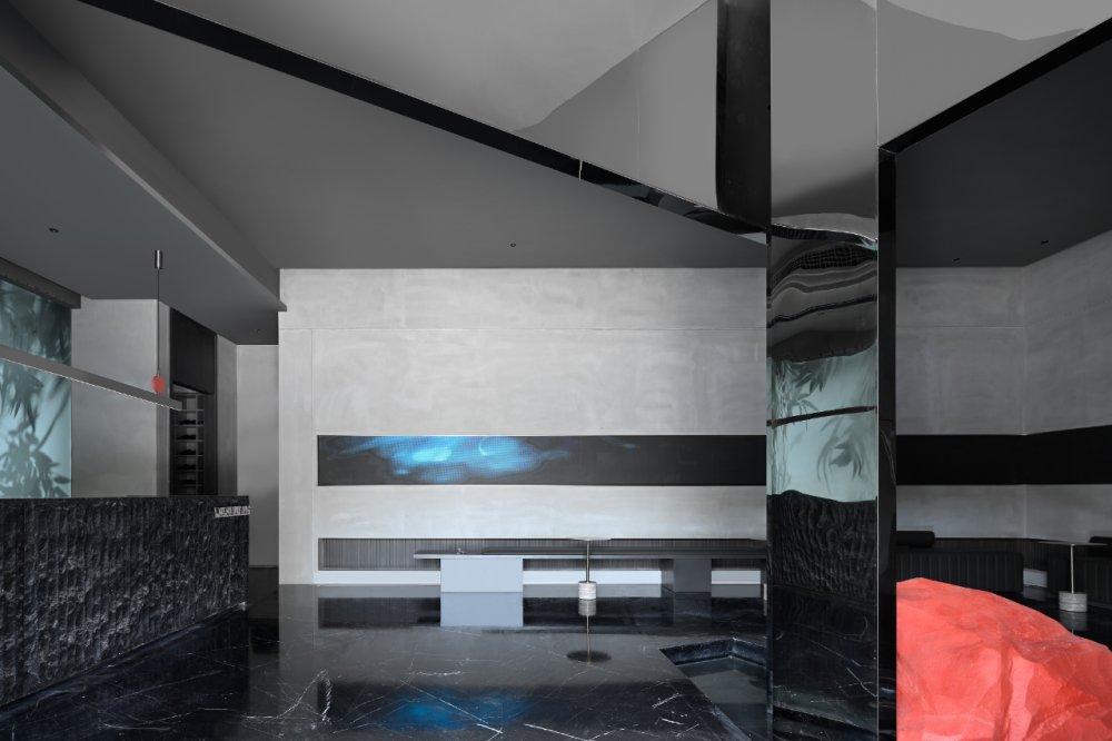 - 山與水的結(jié)合,是江南小景的象征。錯(cuò)落有致的線條盤踞在整個(gè)空間之上,搭配著暖黃的燈光,“野蠻”地從空間生長(zhǎng)開來。在整體的幽暗環(huán)境的襯托下,一絲微光點(diǎn)綴,讓光與“影”曖昧互融。