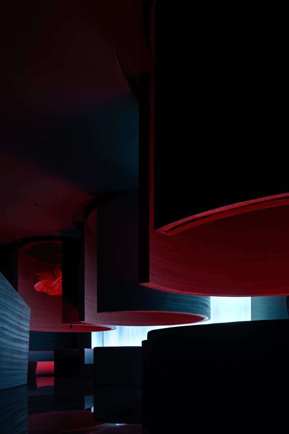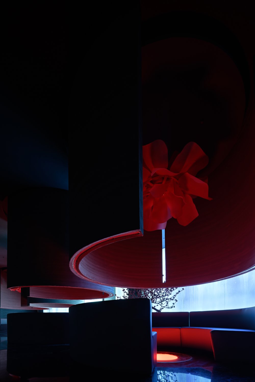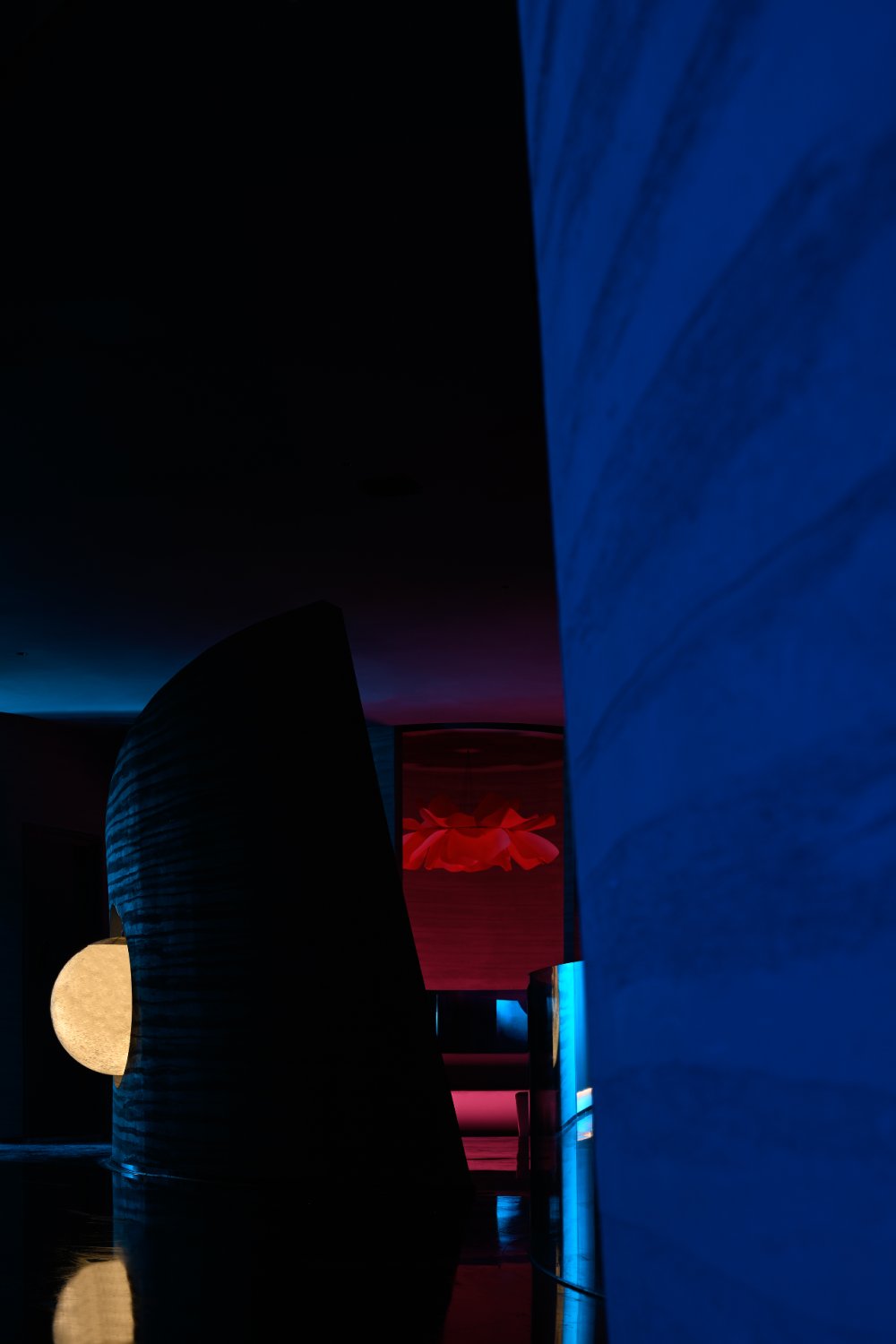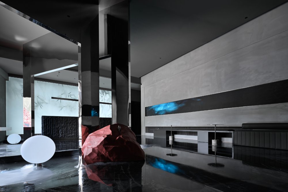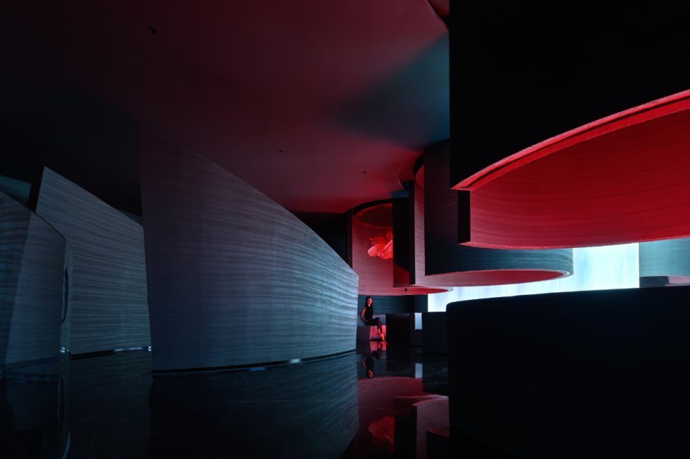 - 接天水碧,山巒環(huán)繞;巨型的花燈搖曳欲墜。墻,連接著頂和地,破開了整體,同時(shí)也起到了一定的隱秘性。流動(dòng)的曲線與空間相得映彰,宛如一個(gè)姿柔體態(tài)的江南女子。