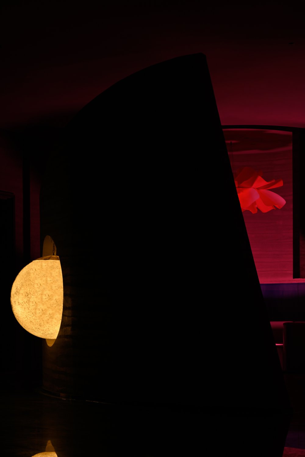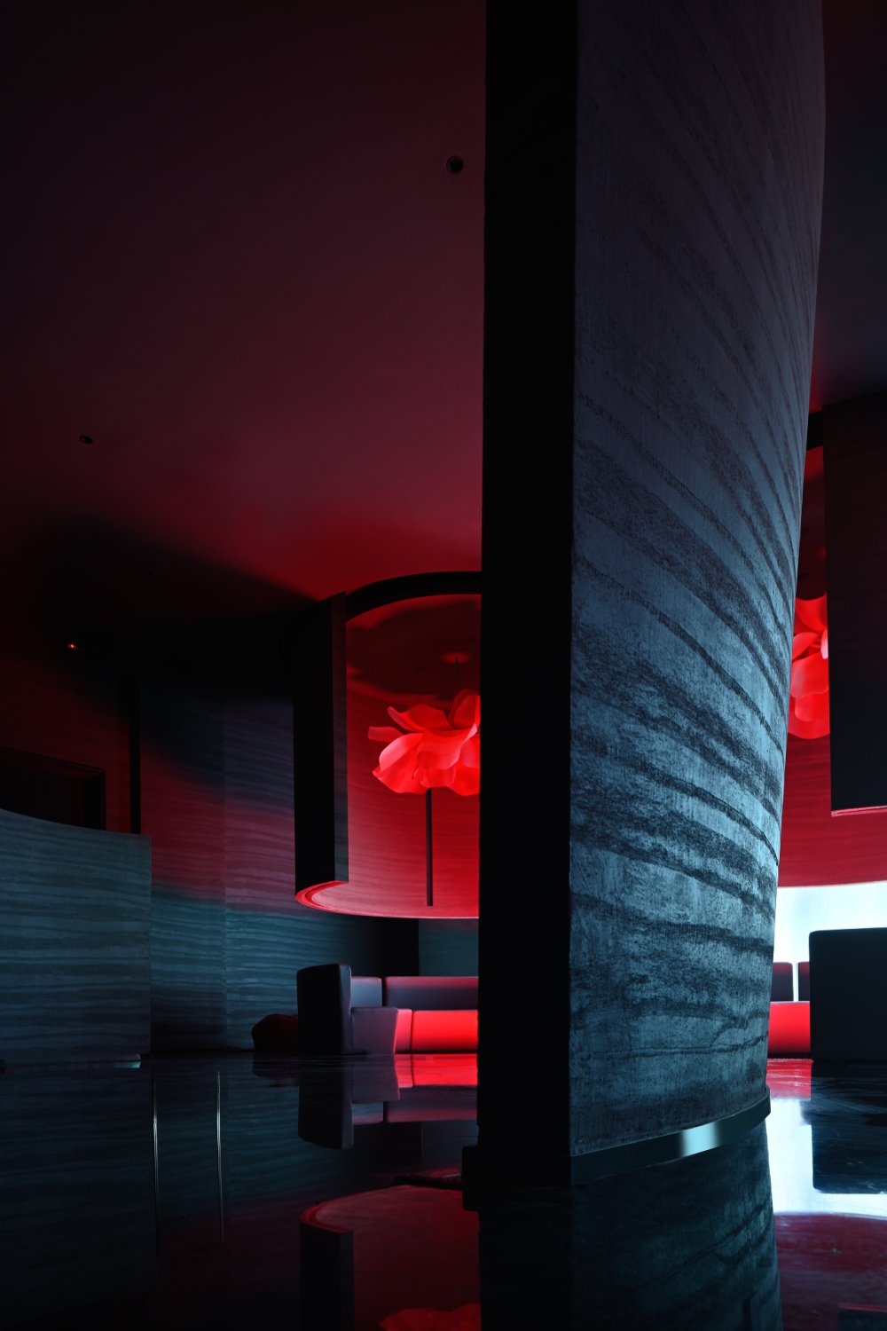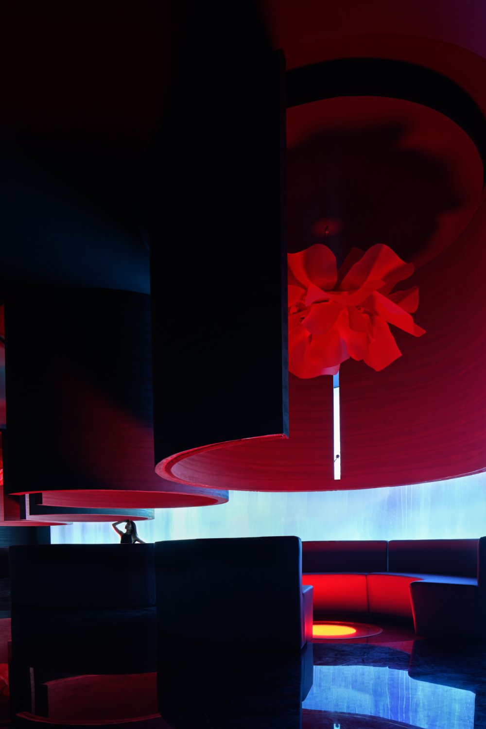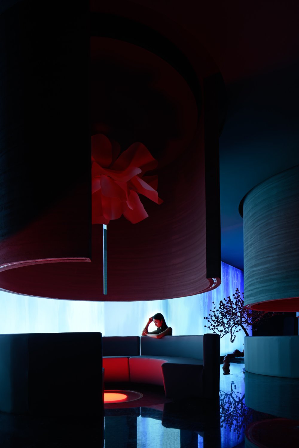- 接天水碧,山巒環(huán)繞;巨型的花燈搖曳欲墜。墻,連接著頂和地,破開了整體,同時(shí)也起到了一定的隱秘性。流動(dòng)的曲線與空間相得映彰,宛如一個(gè)姿柔體態(tài)的江南女子。