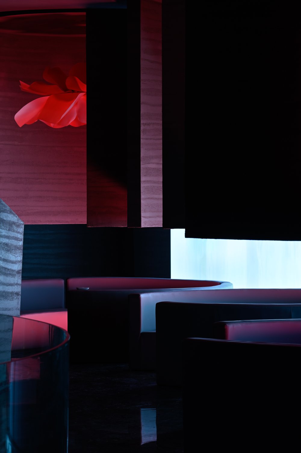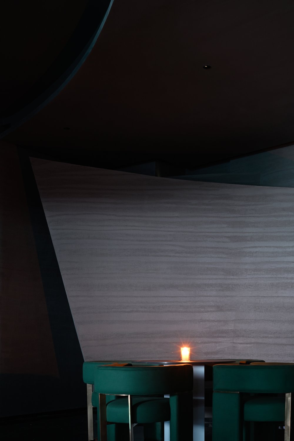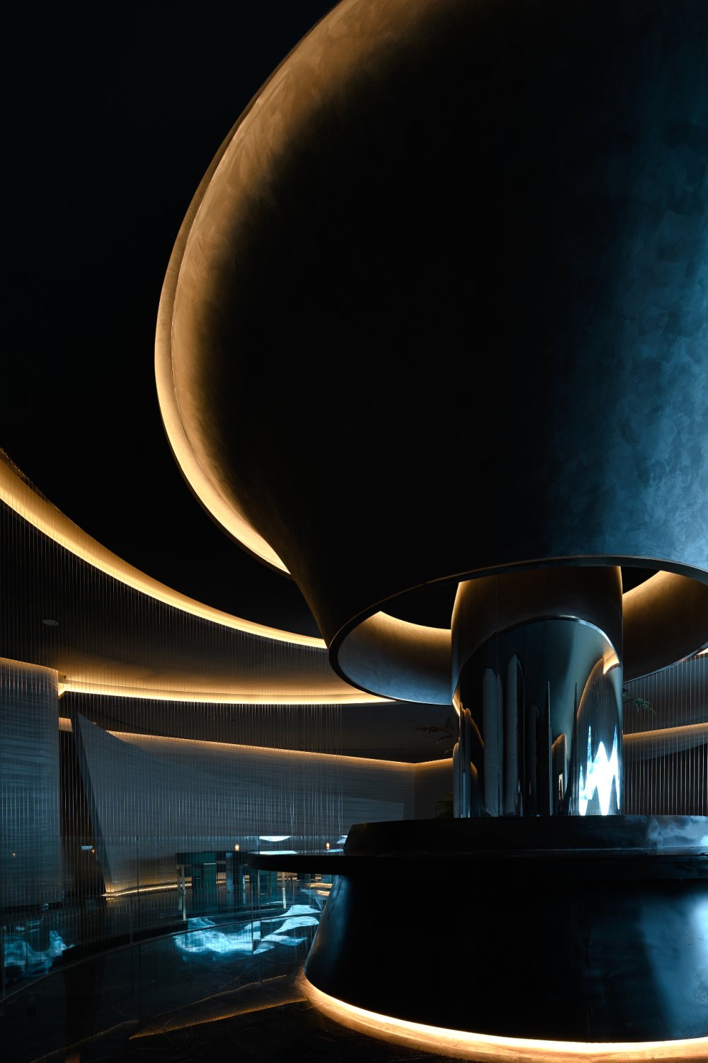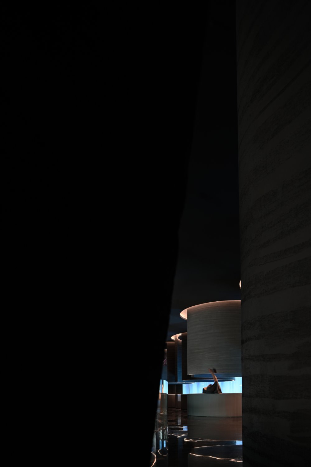 - 接天水碧,山巒環(huán)繞;巨型的花燈搖曳欲墜。墻,連接著頂和地,破開了整體,同時(shí)也起到了一定的隱秘性。流動(dòng)的曲線與空間相得映彰,宛如一個(gè)姿柔體態(tài)的江南女子。
