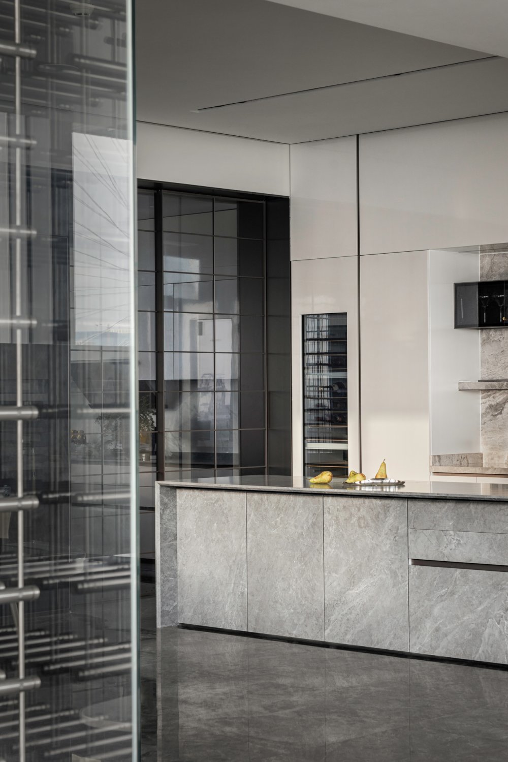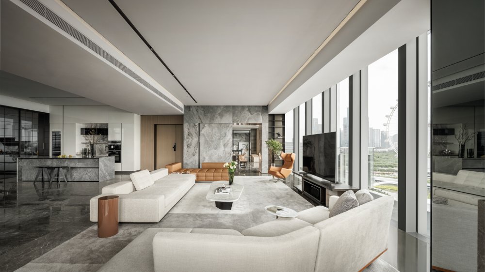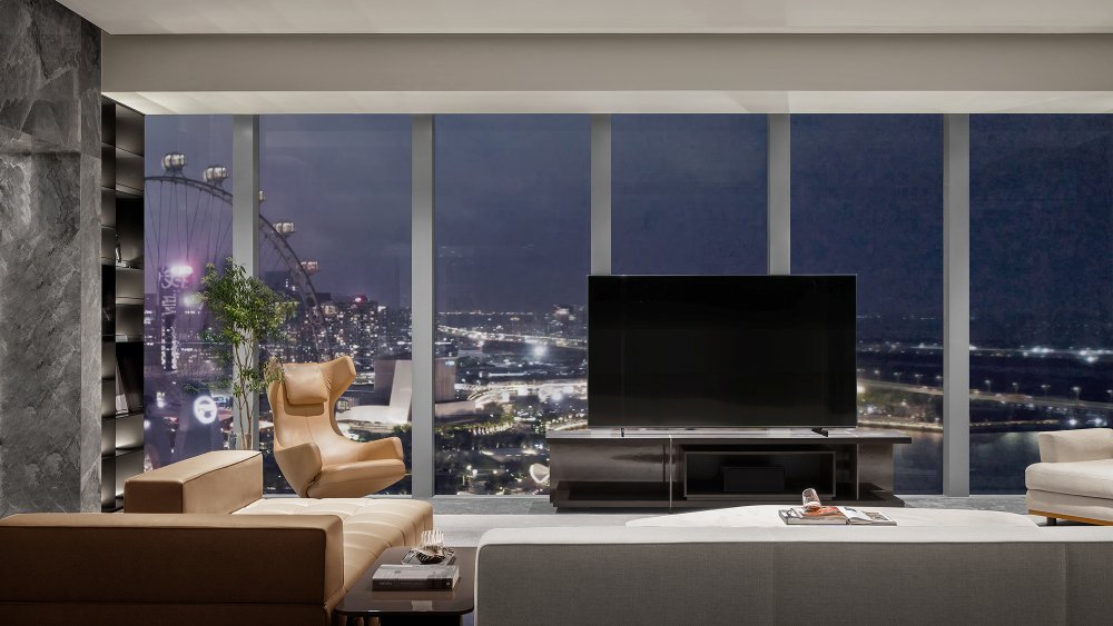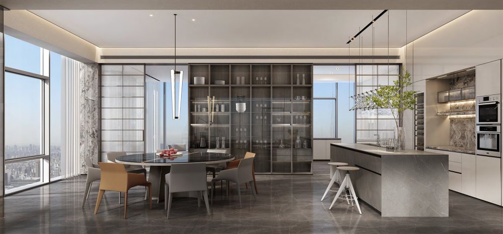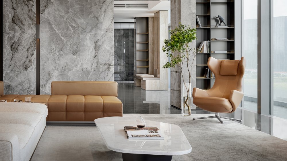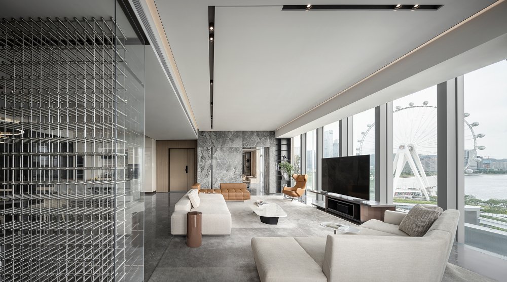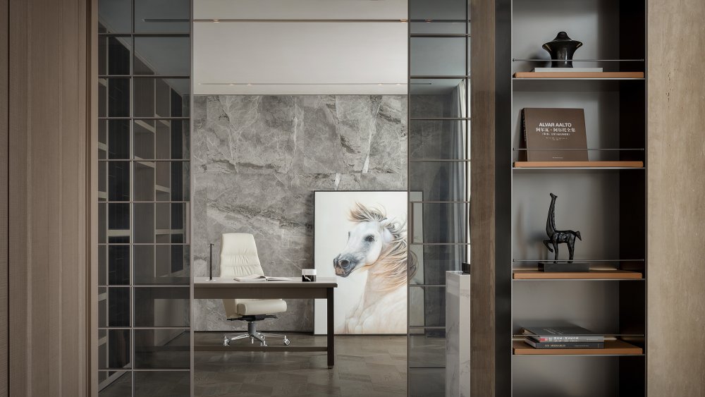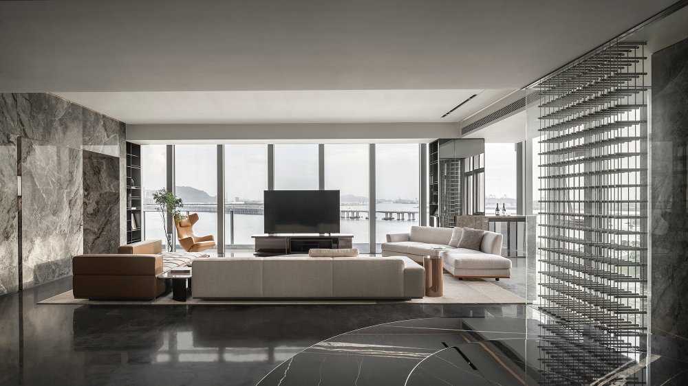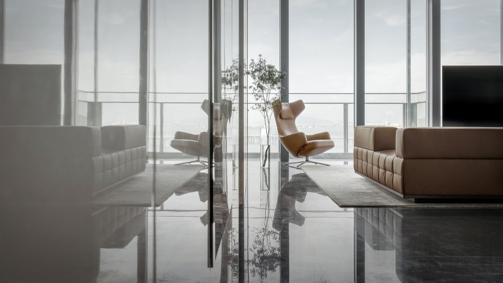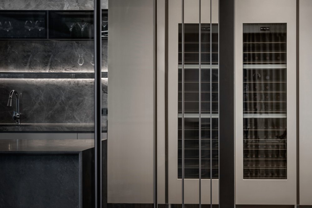 內(nèi)建筑式手法打造的觀景休息廳,高級(jí)灰調(diào)馬鞍皮柜體,朦朧玻璃材質(zhì)電動(dòng)門(mén),以及閃耀金屬光澤的酒架......成為隨處可見(jiàn)、精心設(shè)置的巧思與細(xì)節(jié)。