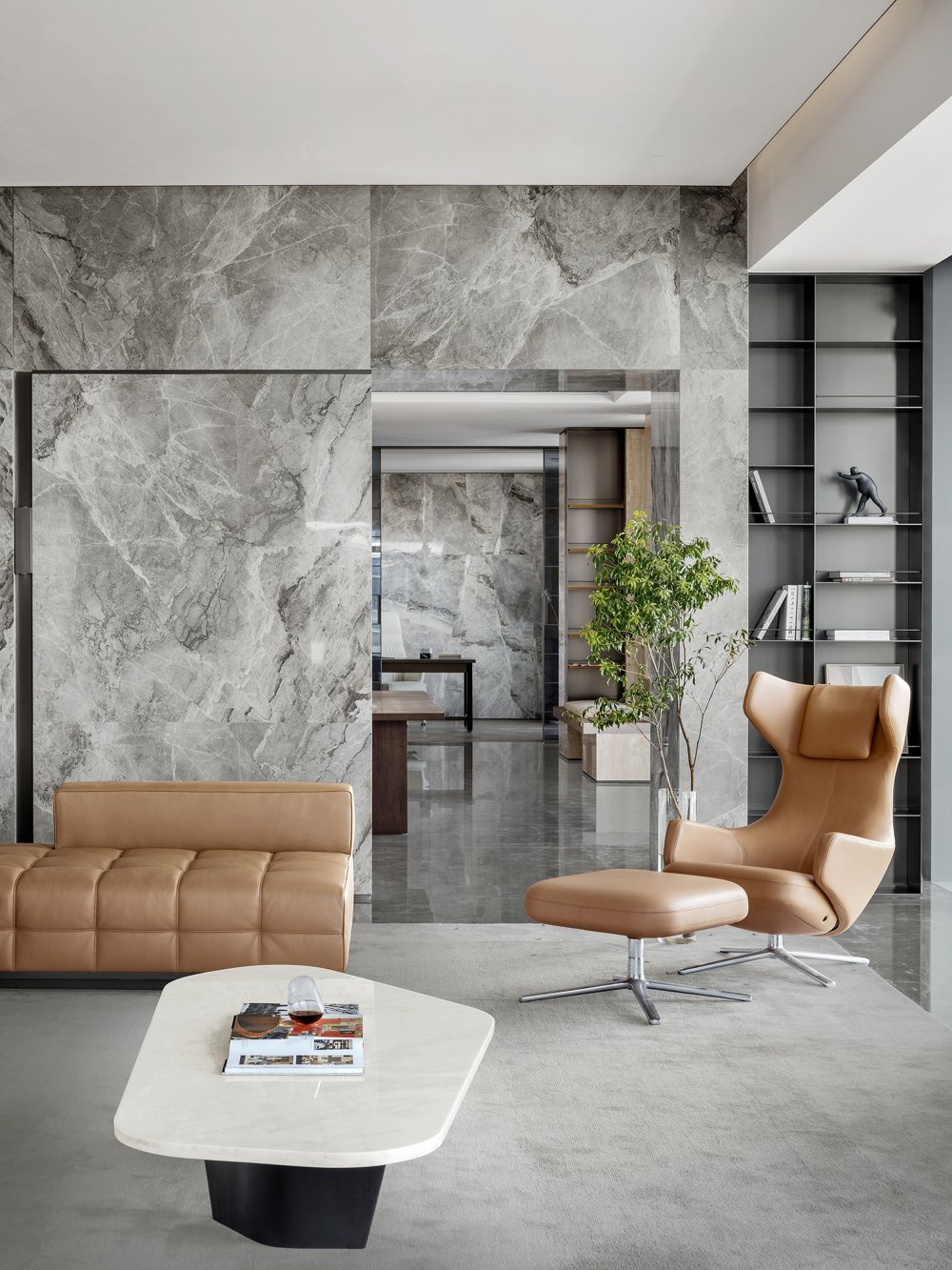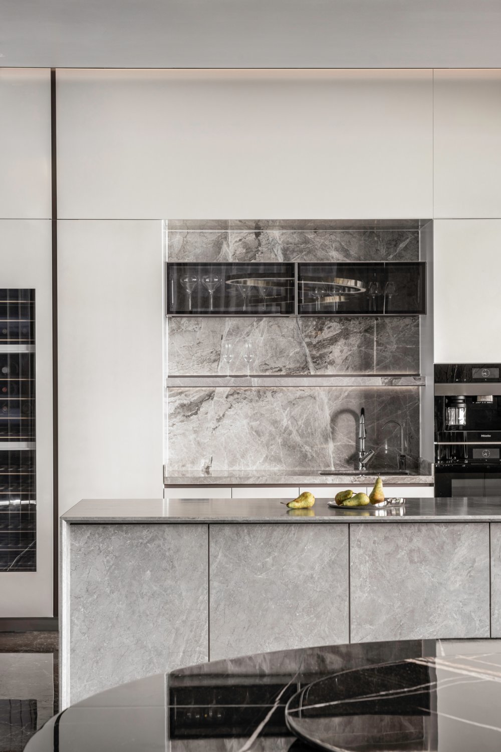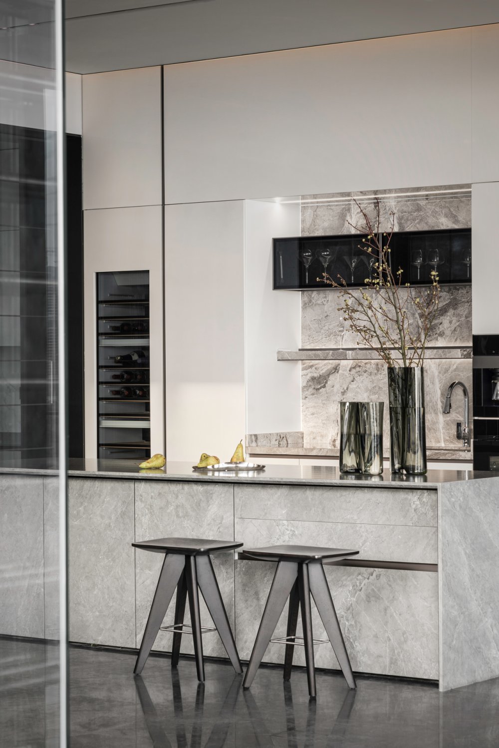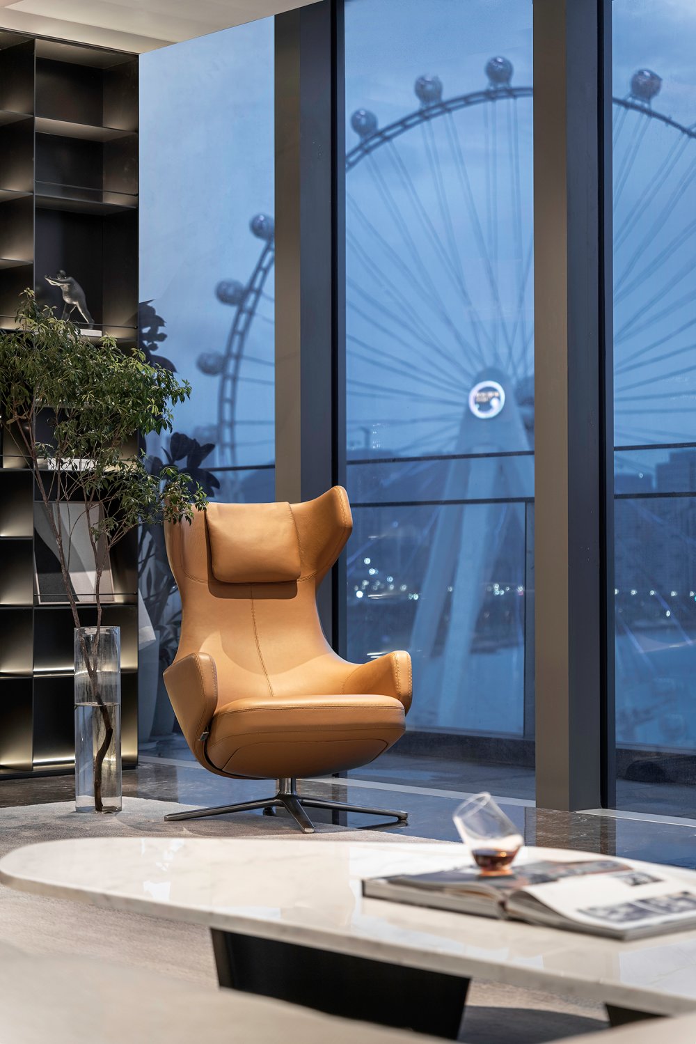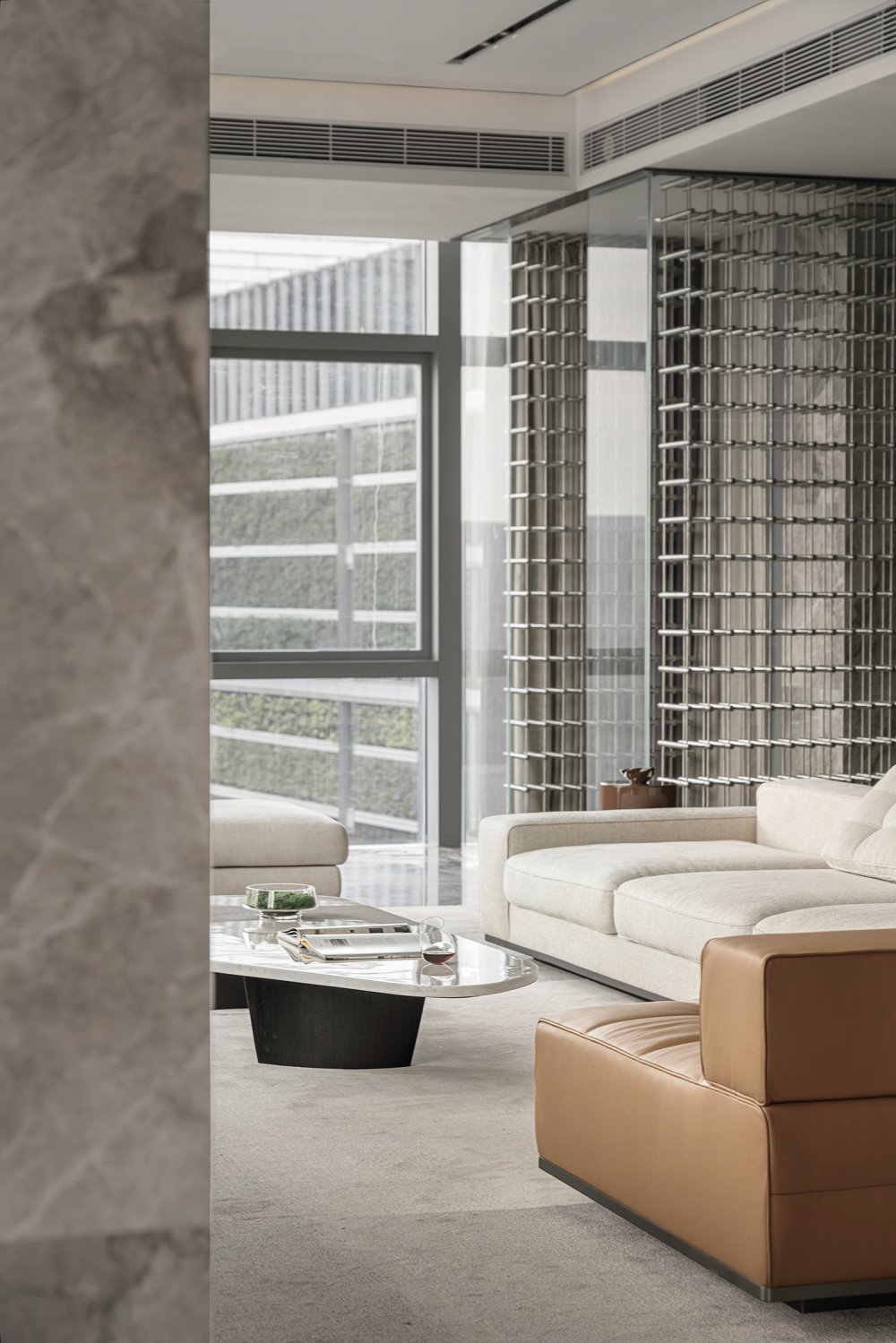 內(nèi)建筑式手法打造的觀景休息廳,高級(jí)灰調(diào)馬鞍皮柜體,朦朧玻璃材質(zhì)電動(dòng)門(mén),以及閃耀金屬光澤的酒架......成為隨處可見(jiàn)、精心設(shè)置的巧思與細(xì)節(jié)。
