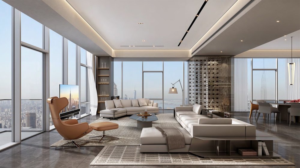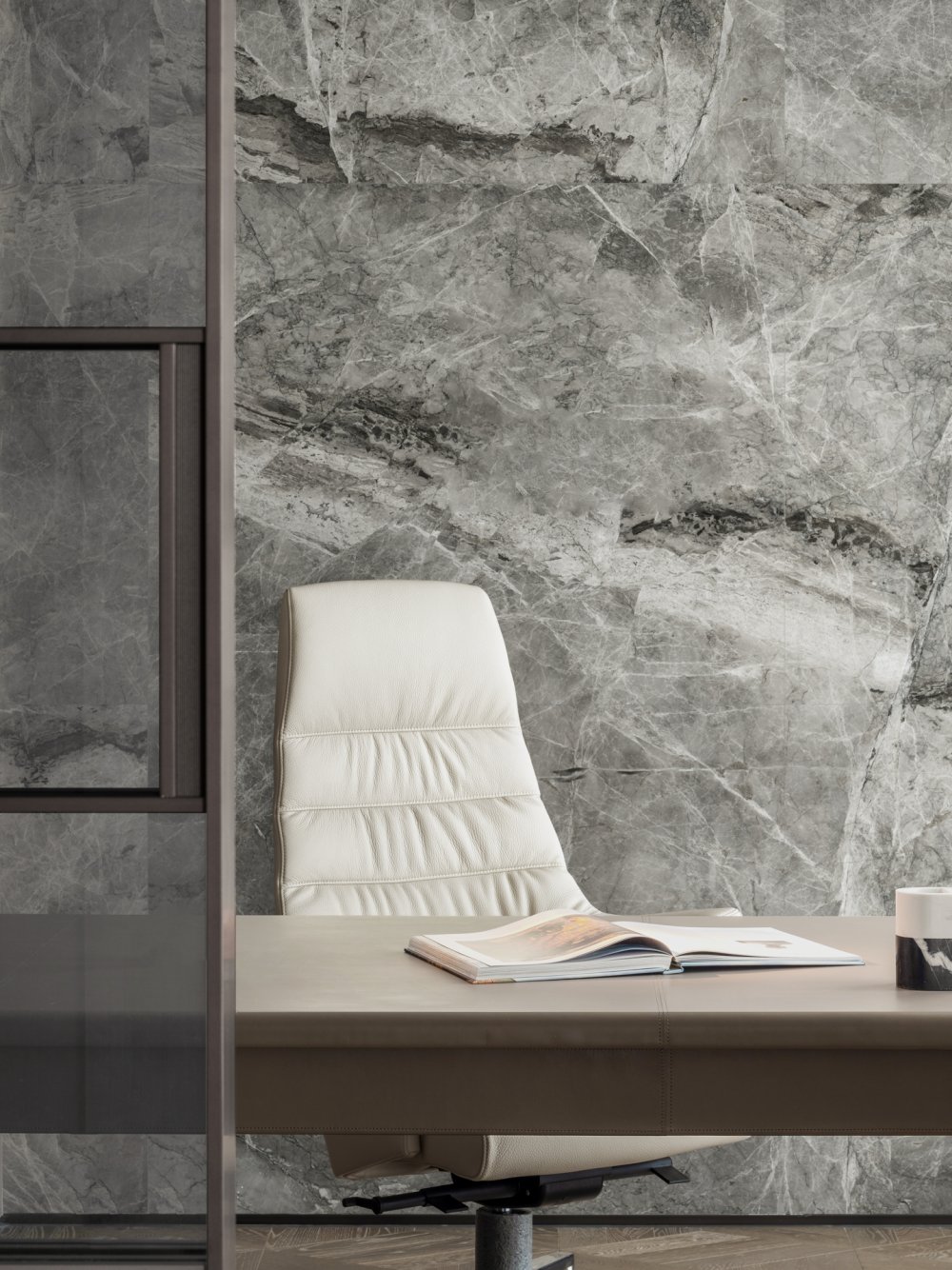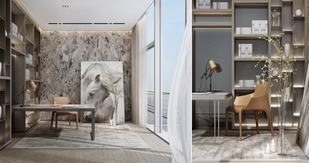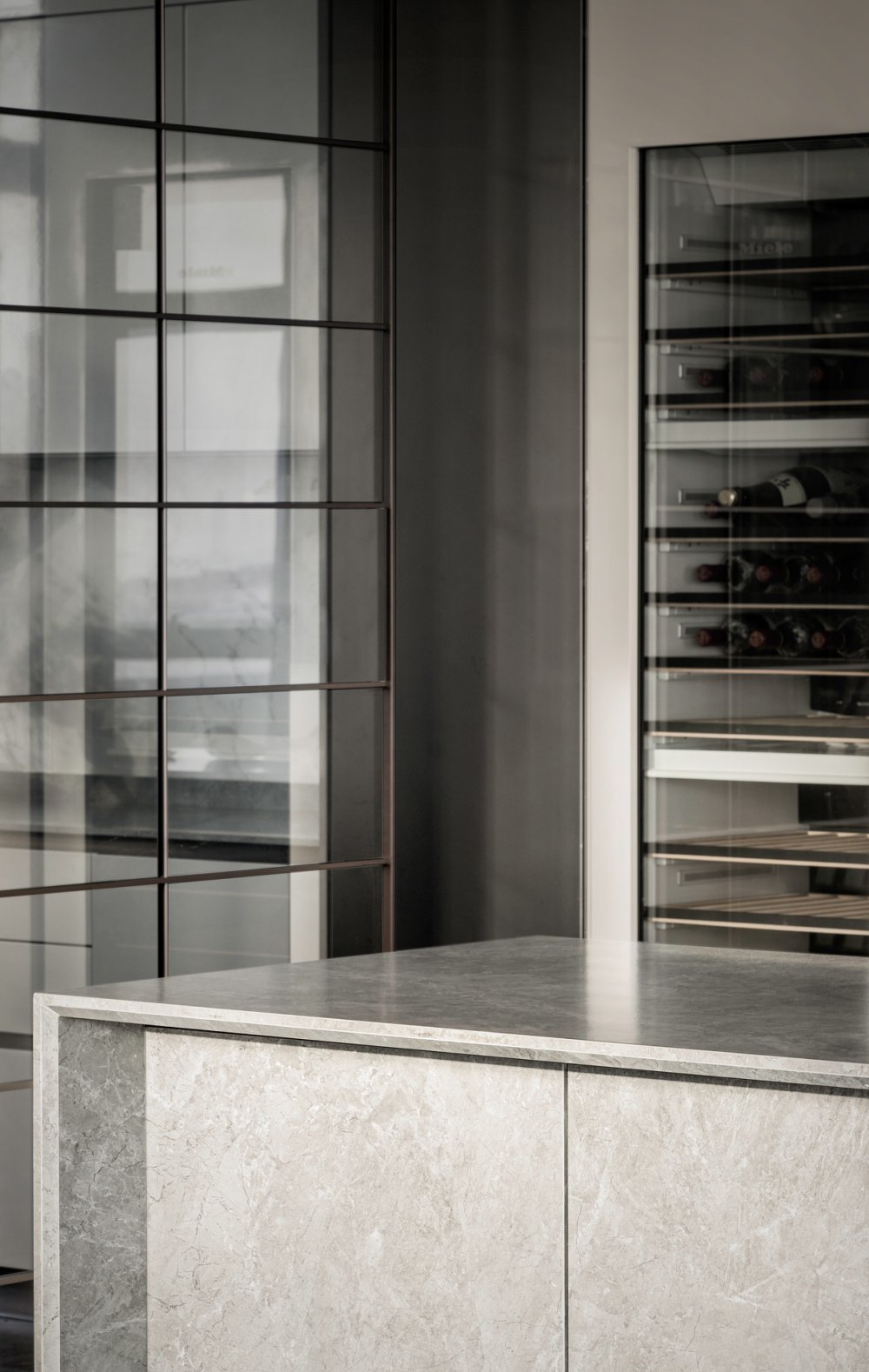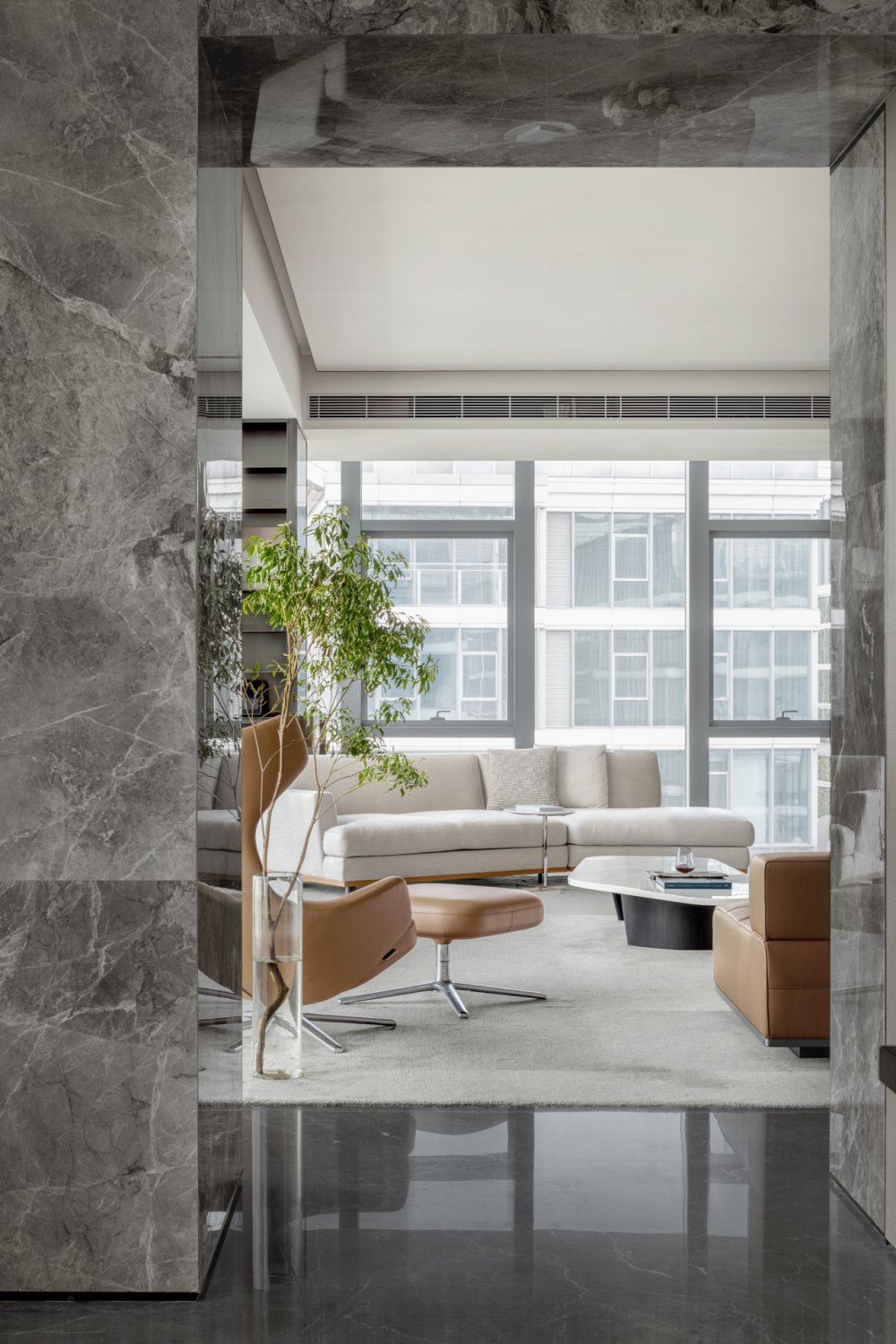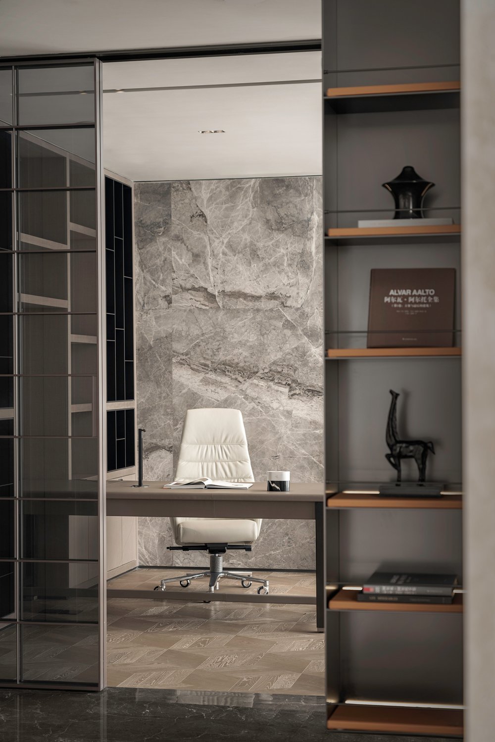 內(nèi)建筑式手法打造的觀景休息廳,高級(jí)灰調(diào)馬鞍皮柜體,朦朧玻璃材質(zhì)電動(dòng)門(mén),以及閃耀金屬光澤的酒架......成為隨處可見(jiàn)、精心設(shè)置的巧思與細(xì)節(jié)。