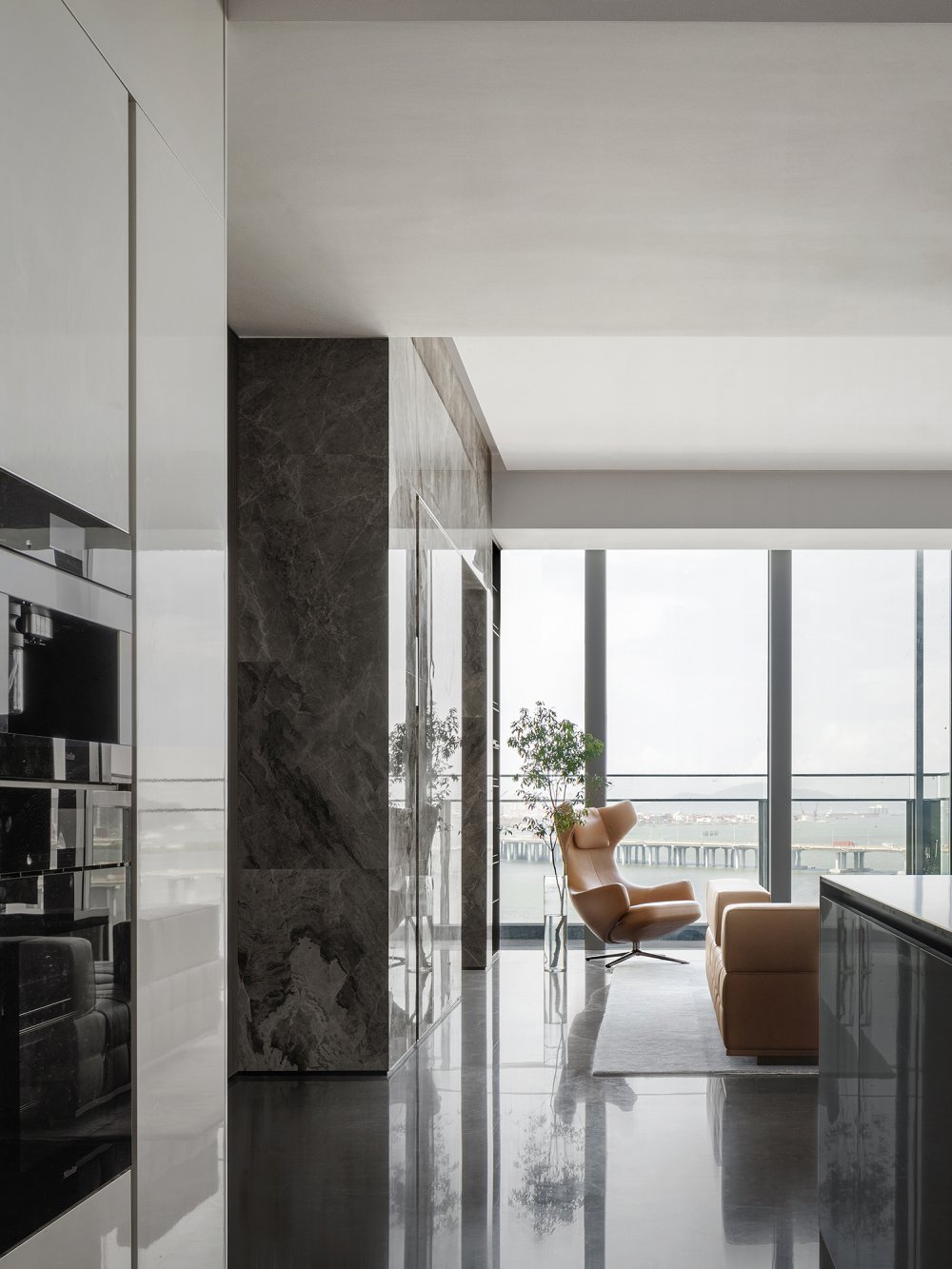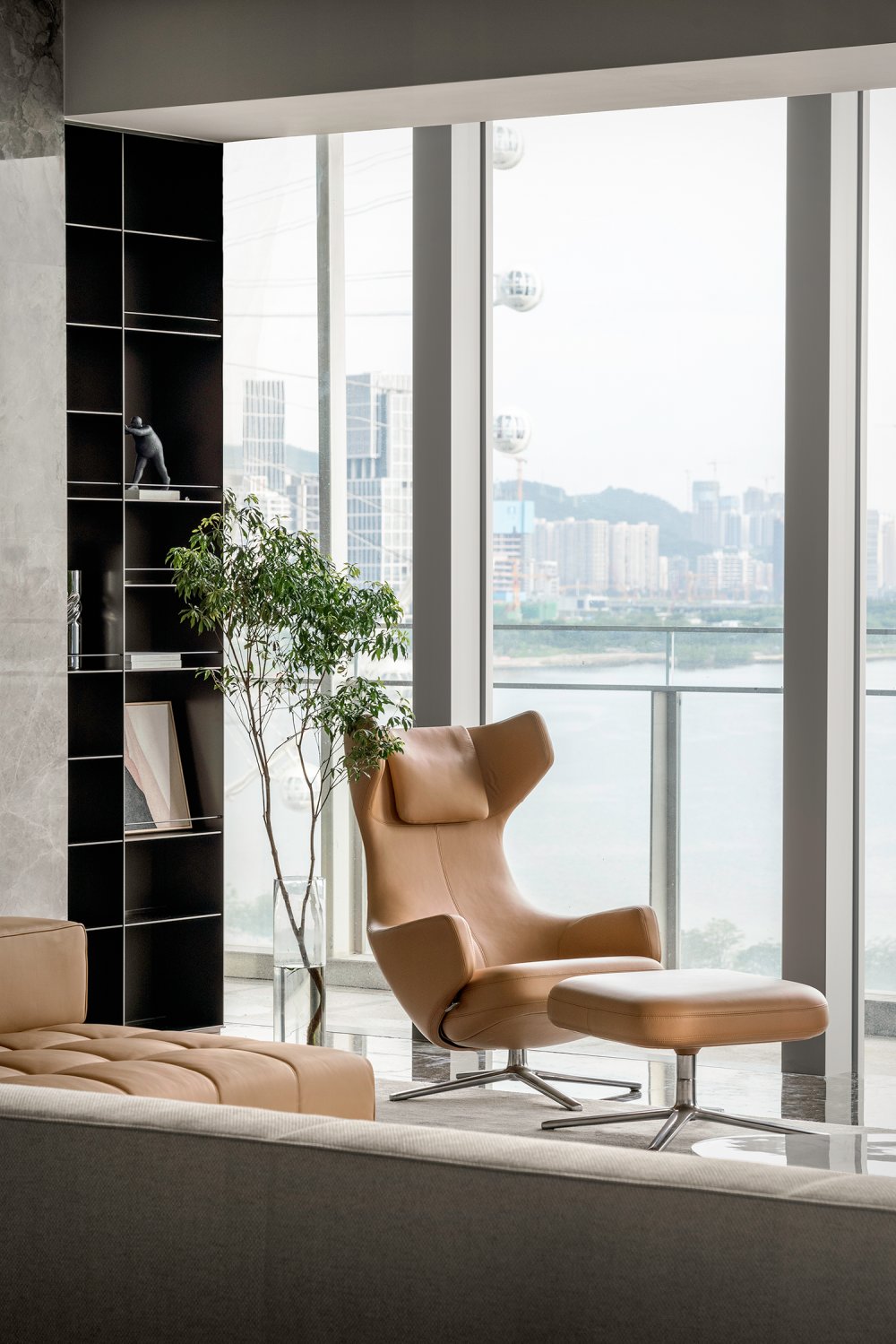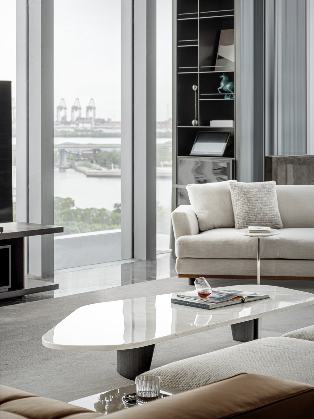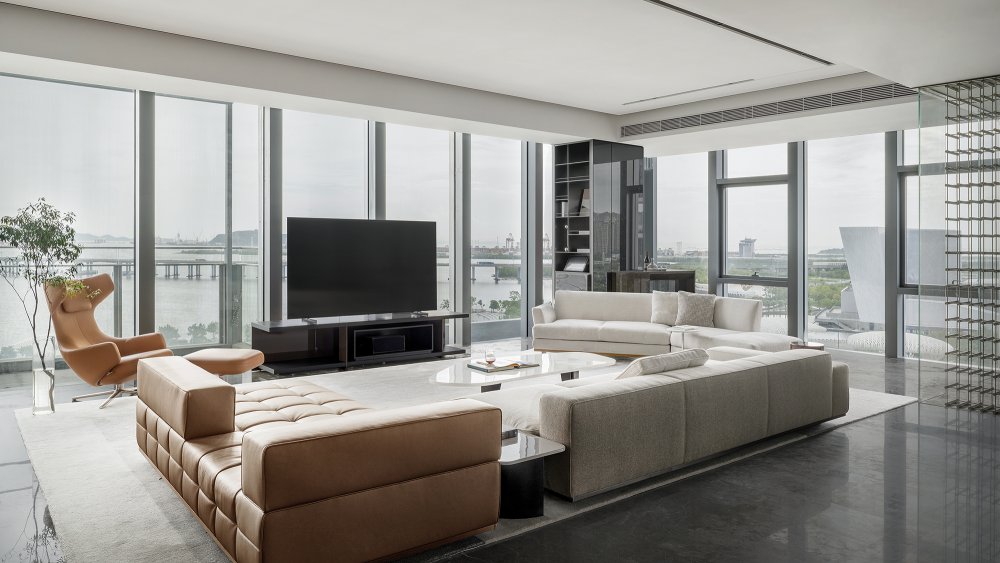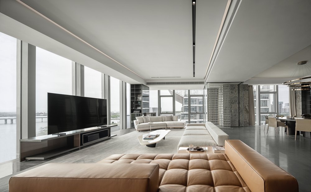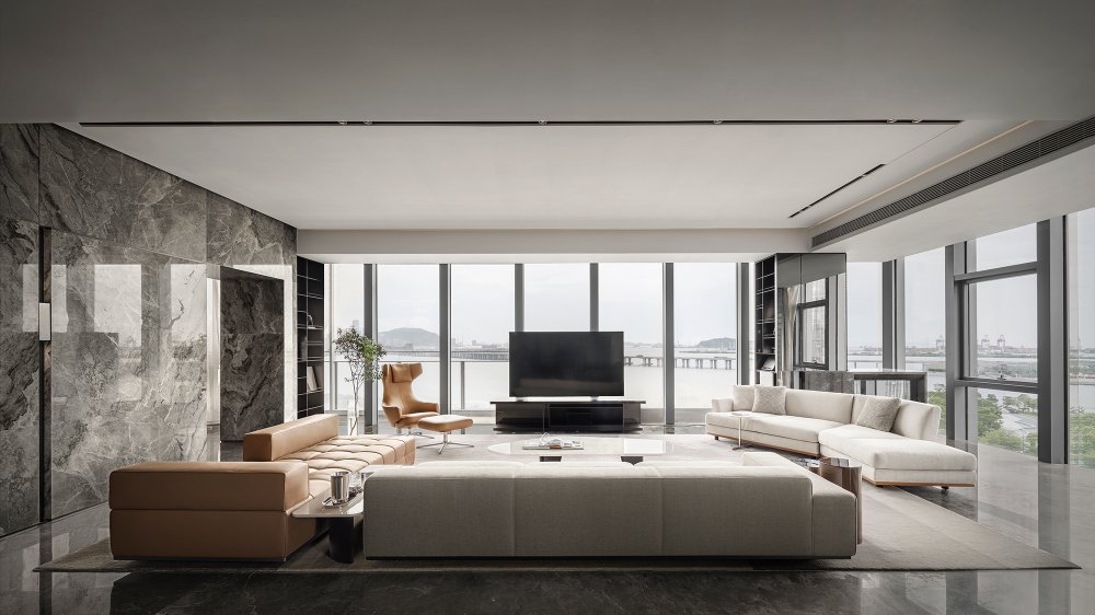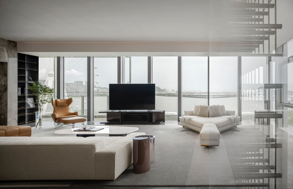 - 有別于窗外景色的豐富飽滿(mǎn),會(huì)客廳用不同程度色調(diào)的白、棕、灰表達(dá)著愈發(fā)沉靜的內(nèi)斂。